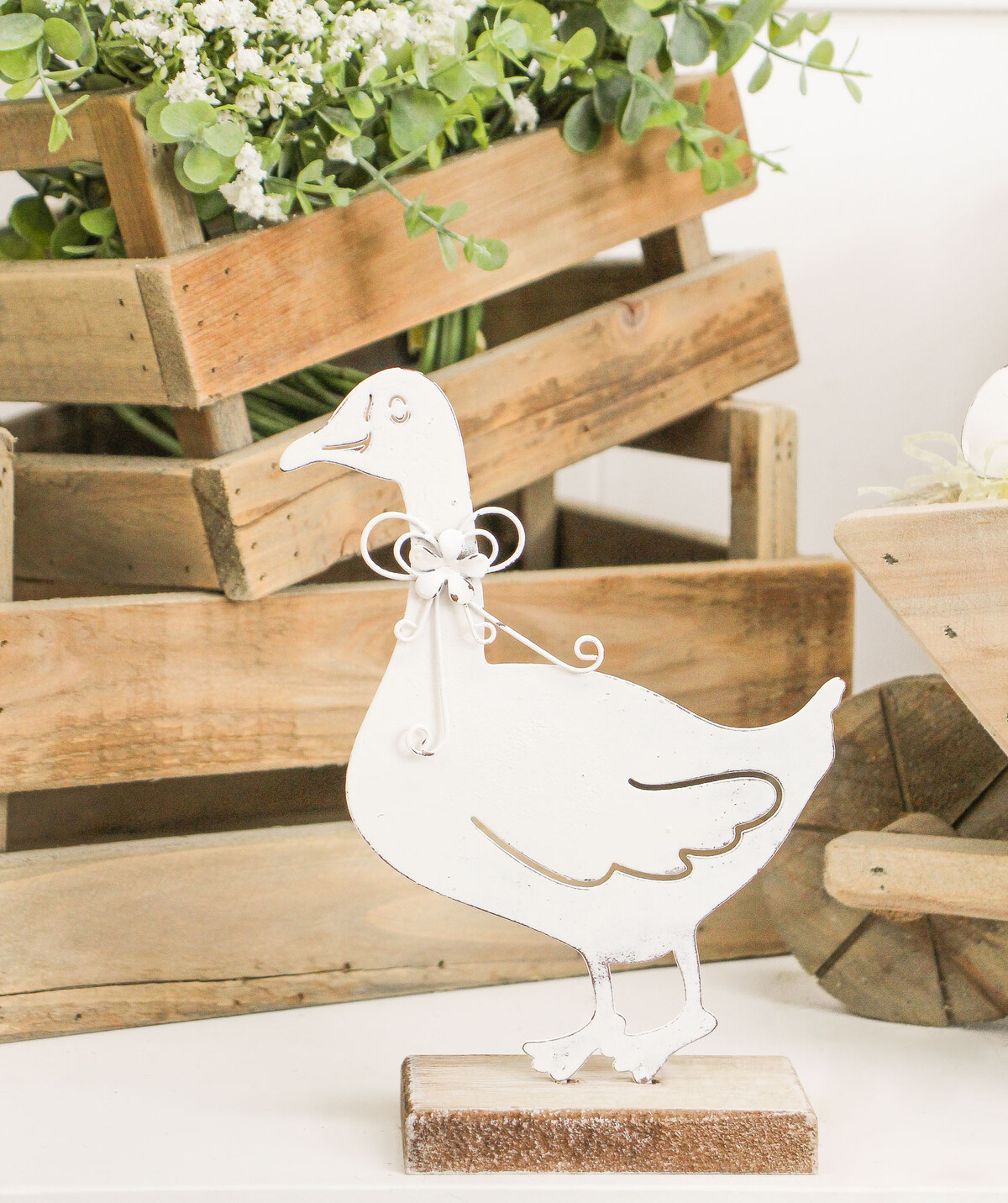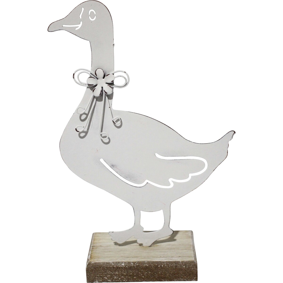 They waddle and quack and make their presence felt with the flapping of their wings -farm and country in nature-this Duckity Duck will be quite a conversation starter reminding you of idyllic holidays in the country or your childhood away from the city life. Make your interiors were the refreshing look of simplicity using décor accents that lean into this quaint and simple cottage kind of vibe. Made of metal-washed in white paint and placed on a wood made stand gives it great balance. Add this and other farm look creatures and accessories to add to the look of your outdoor or indoor spaces. Add plants and similar nature accent to complete the look. Handcrafted and given a well-rounded finish, the duck on stand can be a great means to build on a whole new farm and country look for your spaces.