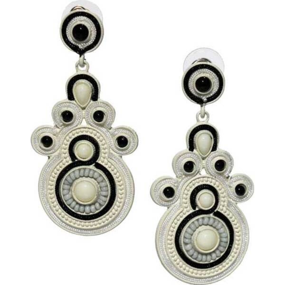 Made of metal alloy and encrusted with pretty little diamonte all over, the detailing has been done with great care as has been the highlighting with black beads. A great fusion of colour and design, these danglers would make quite a statement if worn in the evening with a nice dress or with any kind of formal dressing. The metal alloy will give it body yet not too much of weight and thus it may be worn for longer hours without discomfort. The design is symmetrically very pleasing as it has some very pretty curved shapes that creates the look of classic old world danglers. The subtle play of white and gray pearl like embellishments look stunning as do the black onyx like stones that seem to give this piece a whole new feel. Worn with a white shirt or a black dress, it would look as sensually attractive. A wonderful piece that displays expert craftsmanship and is a must - have for all those who like elaborate detailing in their jewellery.