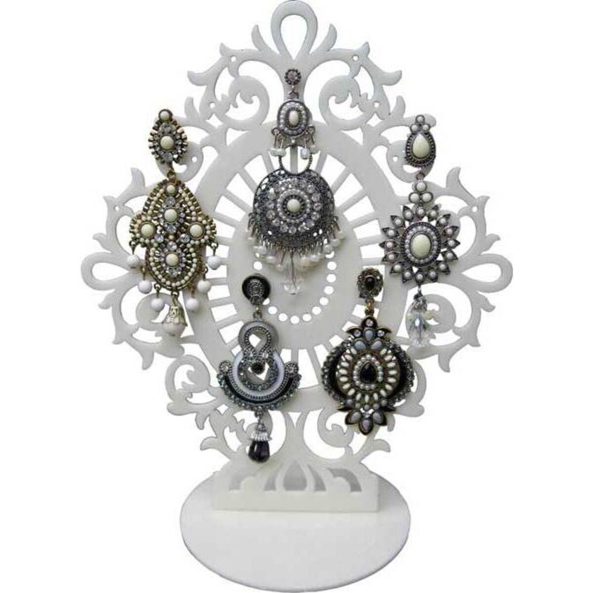 This earring stand isn't just functional, but also beautiful. It features a diamondesque white fixture that has a filigree oval at the center and is accompanied by large swirls, all of which is attached to a secure, flat white stand that will keep the piece standing upright. Throughout the fixture are tiny white holes from which you can attach your earrings. Your jewellery is much more to you than accessories, they're works of art, so why shouldn't you display them proudly instead of hiding them away in a box?