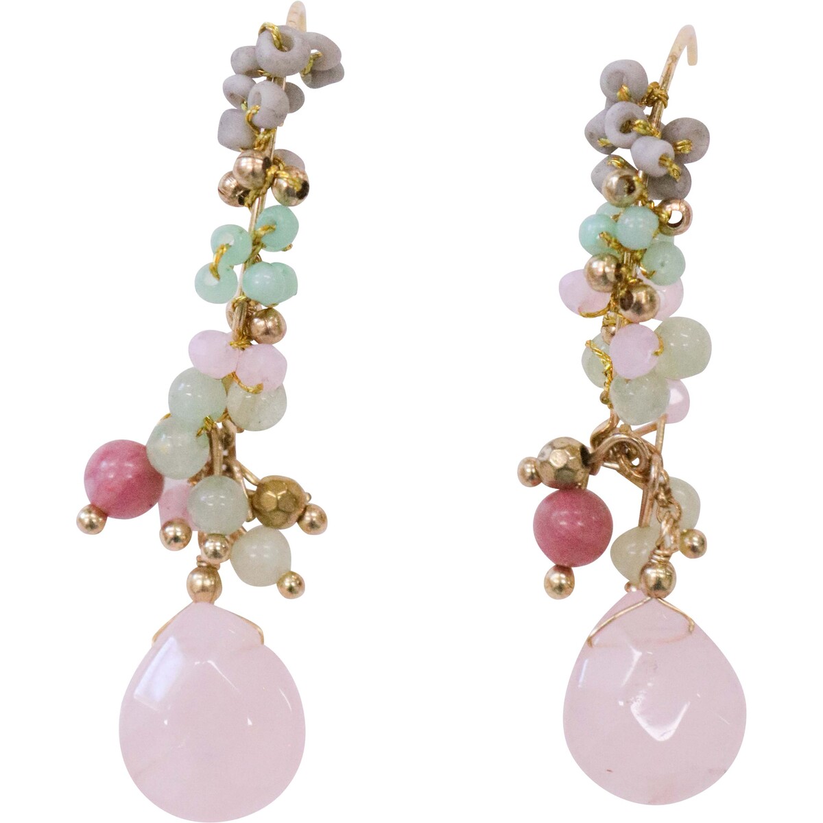 These Earrings Allegra are quite special. Measuring 5cm, they’re just the right length to make a subtle statement without going overboard. The materials - copper, glass, and crystal - come together in a really striking way. That mix of metals and stone-like beads gives these earrings an earthy, organic feel, but at the same time feels delicate and refined. What’s particularly charming here is the soft pastel palette – blush pinks, pale greens, and muted lavenders are very on-trend but also classic enough for all-season wear.