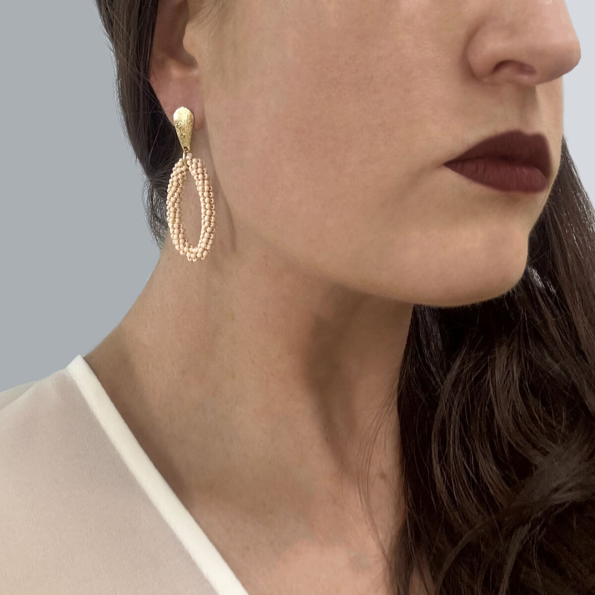What stands out is how versatile these earrings are. We see them going from brunches to dinner parties, or even on weekends by the beach - they're that easy to match. The oval loop is right on trend and we love the soft blush tone of the beads. Presented in our Sol Y Sombra box, they really do make a lovely little gift item too. And being lightweight means they’re comfortable enough for all-day wear.