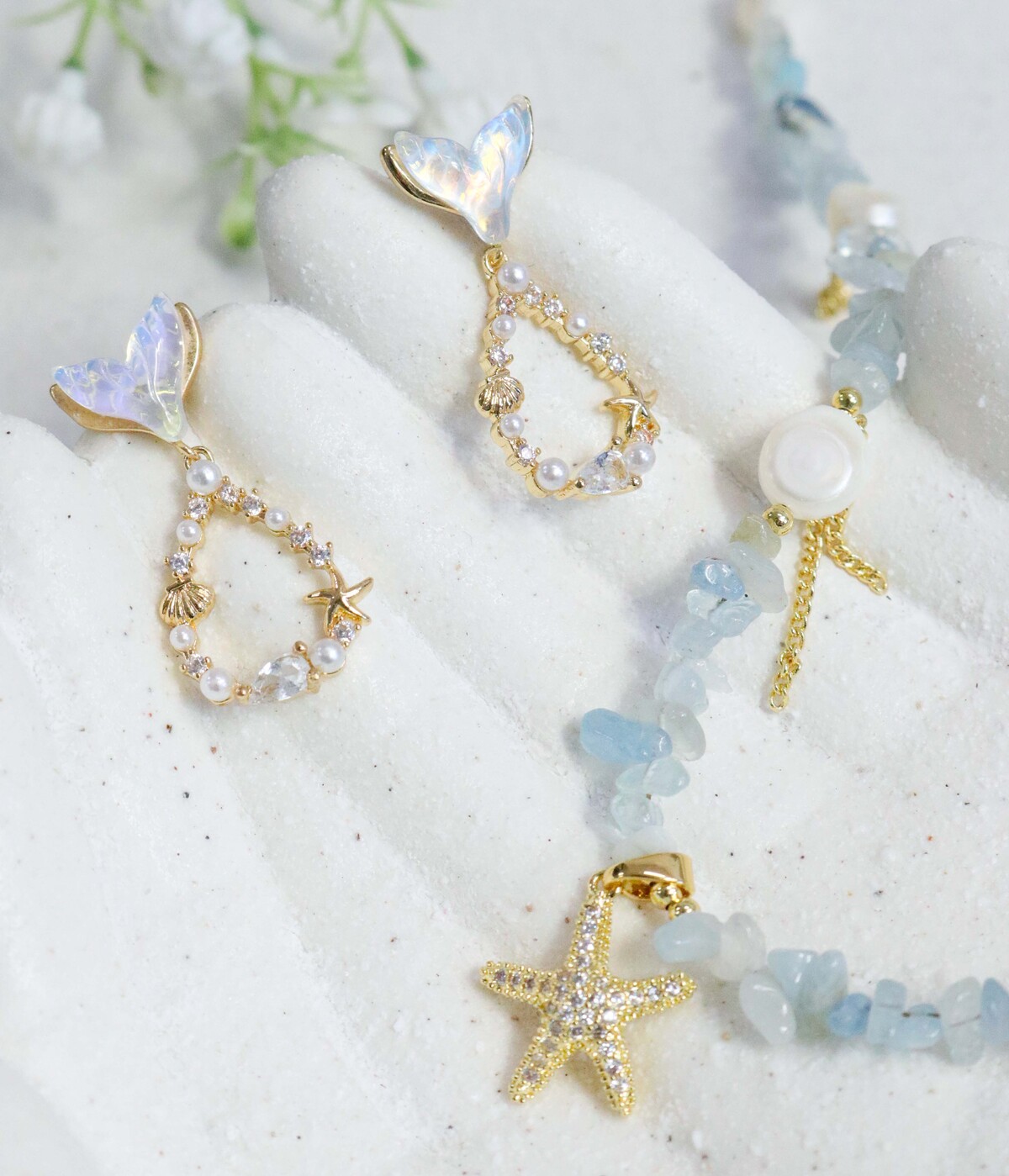 The distinctive design of these earrings makes them versatile for a range of decorative uses, perfect for infusing a touch of coastal glamour into your home or office decor. Picture these earrings elegantly displayed in a shadow box alongside seashells and beach pebbles, creating a serene, beach-inspired vignette. Additionally, they could enhance a vanity area, adding a luxurious, oceanic charm that complements various interior styles, from modern minimalist to shabby chic.