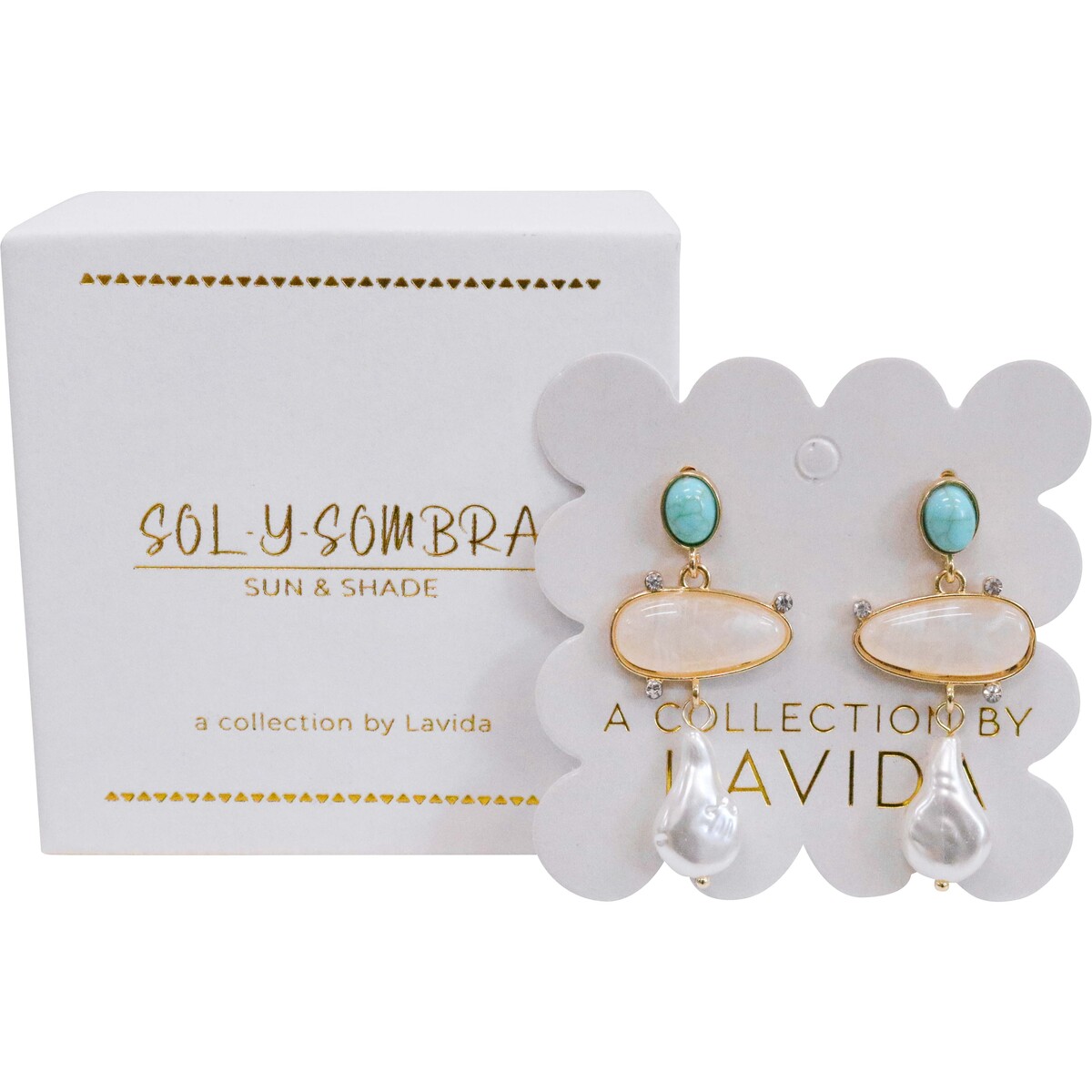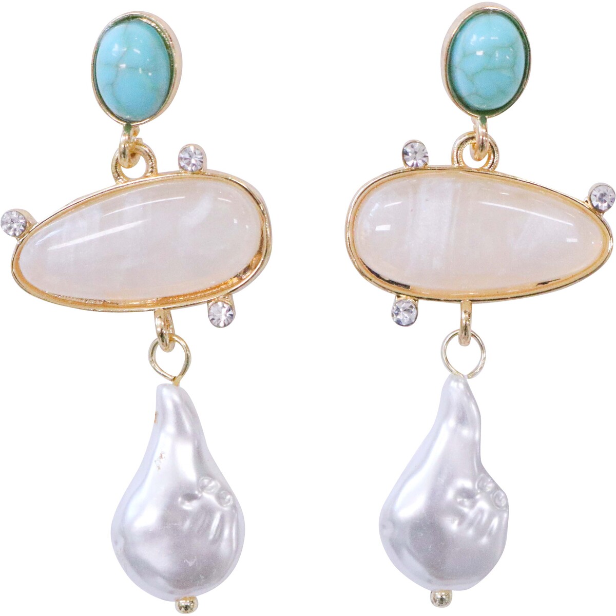 We are so excited to bring retailers like you this stunning new drop - our Earrings Pearl Avenue. We have a bit of a soft spot for these, to be honest. There's just something about the juxtaposition of the organic shapes, the gentle blue-green hue paired with gold, and that delicate pearl drop - it all just works so well together. The irregular design makes them feel almost as though they were made from raw, natural materials - but at the same time the shine is so lovely and polished. They're made from zinc alloy and shell, which means they're lightweight enough to not weigh ears down when worn. The gold is quite shiny and really pops against the ocean-blue bead and cloudy white centrepiece. The little rhinestones add just a touch more sparkle without feeling too glam for regular wear. We can see these flying off your shelves in particular because of how wearable they are with both everyday and fancier attire. At 5cm in length they're bold, but still subtle enough to not compete with outfits that have a lot going on already. Customers will find these very versatile - they make for a perfect gift too (birthdays, valentine's day, self-care).
