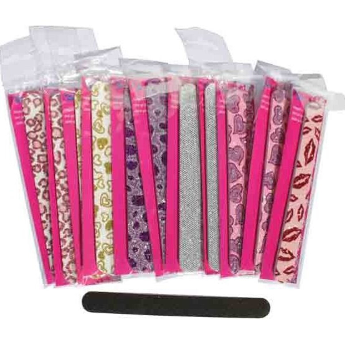 Each emery board feature the following styles: pink board with red kiss mark patterns, pink board with heart shape patterns, lavender board with round violet patterns, yellowish board with golden hearts pattern, light pink board with dark pink leopard pattern, and a silvery board with a gritty diamond-like texture.