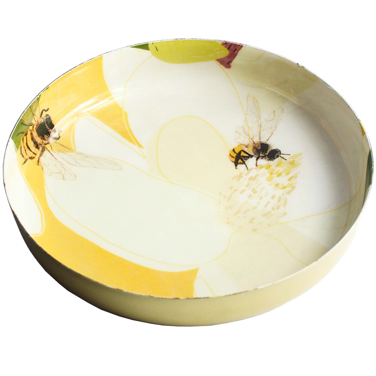 Bring a touch of whimsy and warmth into your customers' homes with the Enamel Tray Mustard Magnolia Med. This exquisitely handcrafted tray measures a versatile 20.5x20.5x4cm, making it an ideal addition for any living room coffee table, office desk, or kitchen counter. The sunny mustard hue, adorned with delicate magnolia blossoms and playful bees, invites nature indoors, creating an ambience of serene summer days all year round.