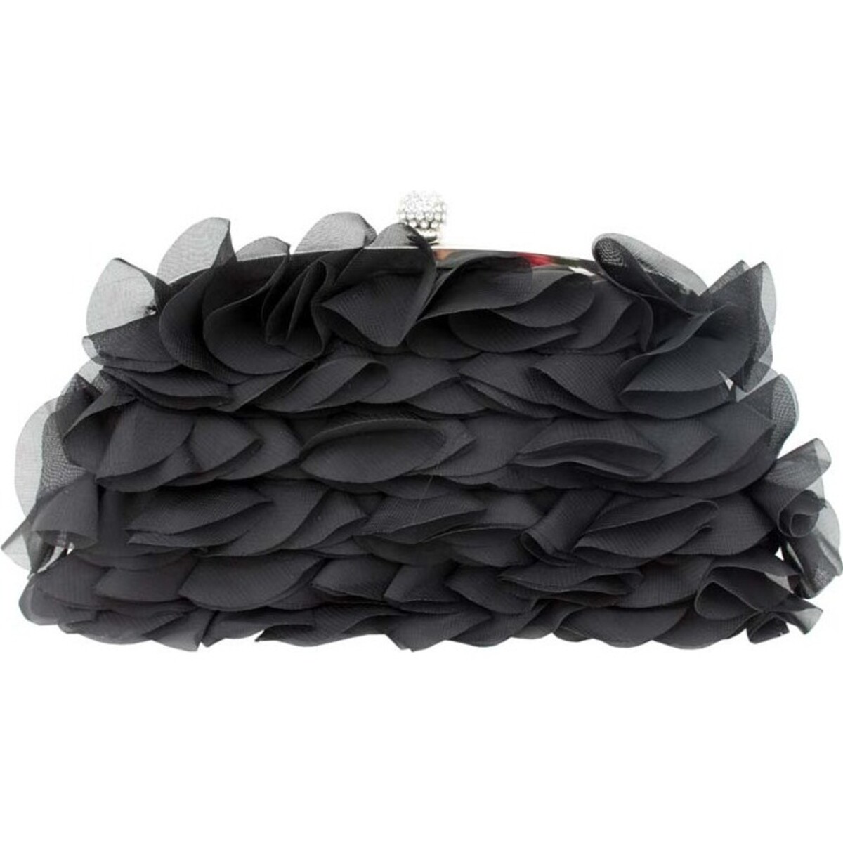 This is a simpler option for those who like the look of black ruffles without all the flash of a faux diamond pattern as well. A length of black taffeta has been sewn to this evening purse in a way that resembles row after row of black rose petals. This evening purse will match every little black dress as well as formal affairs. It opens by way of a metal clasp located near the top of the purse. The knob of the clasp is embedded with diamonte gemstones. This is a small evening purse that comes includes both a long and short chain. It will function equally well as a clutch or shoulder bag. Both options are nice for formal occasions or a night out on the town when your outfit does not conceal many pockets.