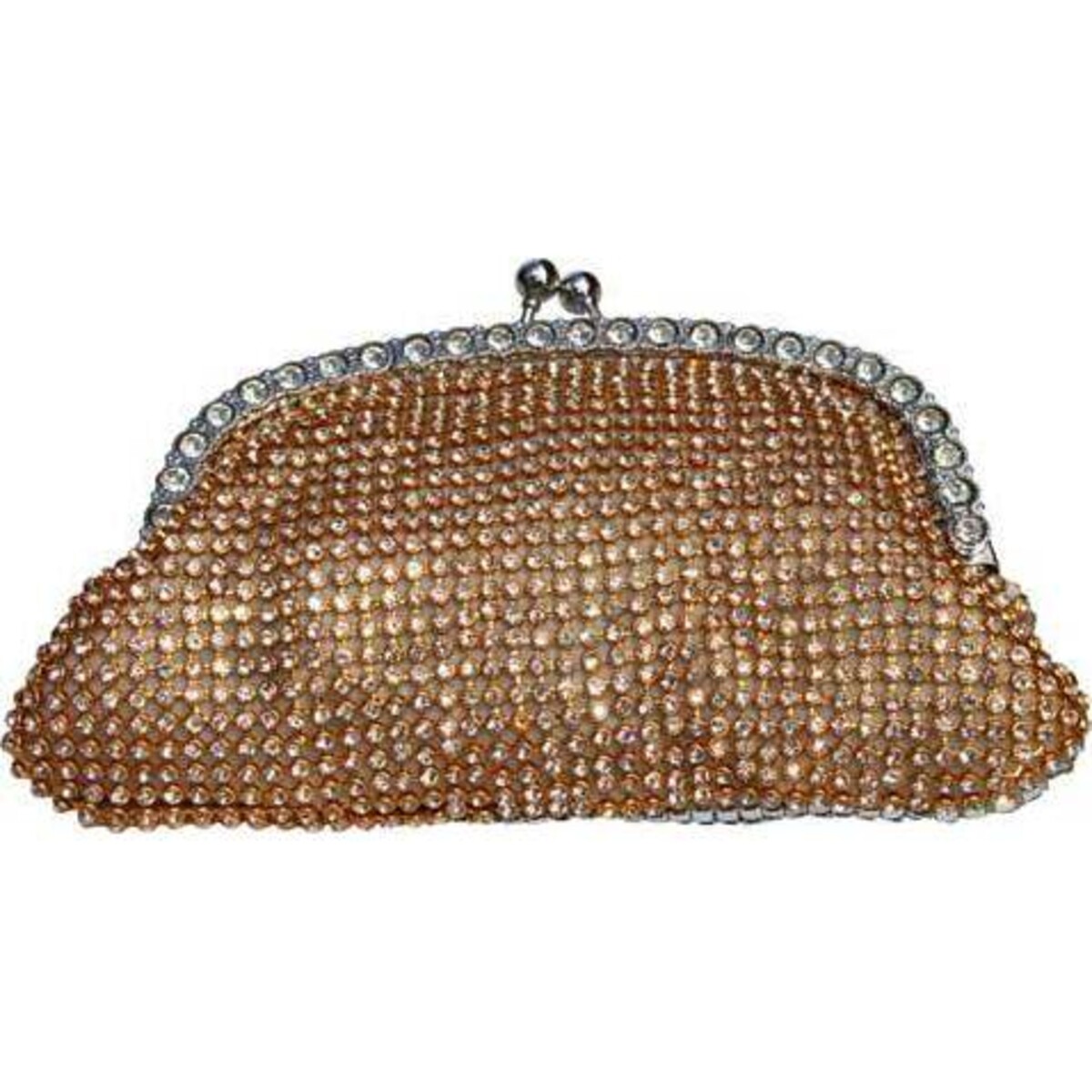 Don't underestimate the big punch of style that comes with this seemingly small evening purse. With gold rhinestones on the body of the purse, and clear rhinestones along the silver frame, it can add a lot of sparkle and shine to even the most bland and boring ensembles. This bag may seem like it should only be used in the evening, but with this much style, you'll find any excuse to use it throughout the day. The best part is that while it functions as an evening bag, it also does double duty as a makeup bag.