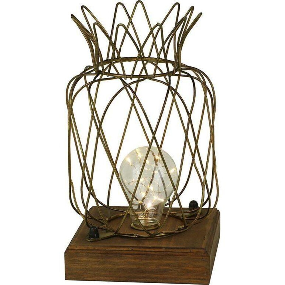 Made of metal and wood, this flat platform holds a pineapple created from metal wires twisted and beautifully shaped to imitate a hollow pineapple and within it holds this bulb made of glass filled with a strand of fairy lights. The chunky wooden base will ensure that the metal frame is stable and the lamp could be placed easily on table tops. A modern twist to usage of lamps in a unique sort of way - the very idea of using the ever popular pineapple shape and fairy lights inside a conventional bulb is a heist of a thought executed with such finesse. Place it in the children's room where some fun and cheer can be created in dull spaces with the inclusion of such lamps. Serious décor articles are always welcome for a change of look but when the ideas are as contemporary and modern, it lends homes it own stamp of extraordinary charm. The height of the lamp is about 26 cm from the bottom right up to its spiked crown while its base is square with dimensions of 14 cm.