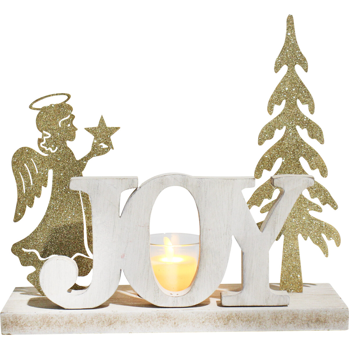 Holiday and festive decorations are all about a cohesive collection of symbols that resonate with the mood and the purpose of the celebration and the simple word - JOY captures it perfectly. For the joy of togetherness and the joy of feeling blessed this little display votive would say it all. The glass votive creates a pretty silhouette with the letters of the word which are positioned right in front whole the fairy and the tree make up the flanks that are highlighted in the most glittering kind of way. The MDF made base and letters are super smooth and the entire piece when placed on top of tales surely will gather a great deal of attention.