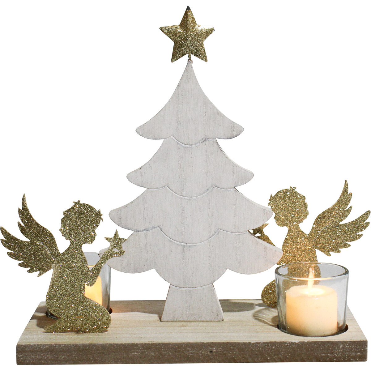 This fairy themed tea light fits across a small console lighting up all your Christmassy paraphernalia, or could be the centerpiece on the dining table where you could surround it with floral decorations that bring more beauty to the space. Crafted from metal, MDF and glass - the gold coloured angels on either side of the two votives that hold the small sized pillar candles. The tree which is a central motif apart from the fairies makes this a stunning displayable piece. The gold and white of the colour scheme adds more to its elegant look. About 29 cm in length - the block of MDF on which the two votives are placed will help light up the symbols on display. The positioning of the fairies also helps create the drama of silhouettes.