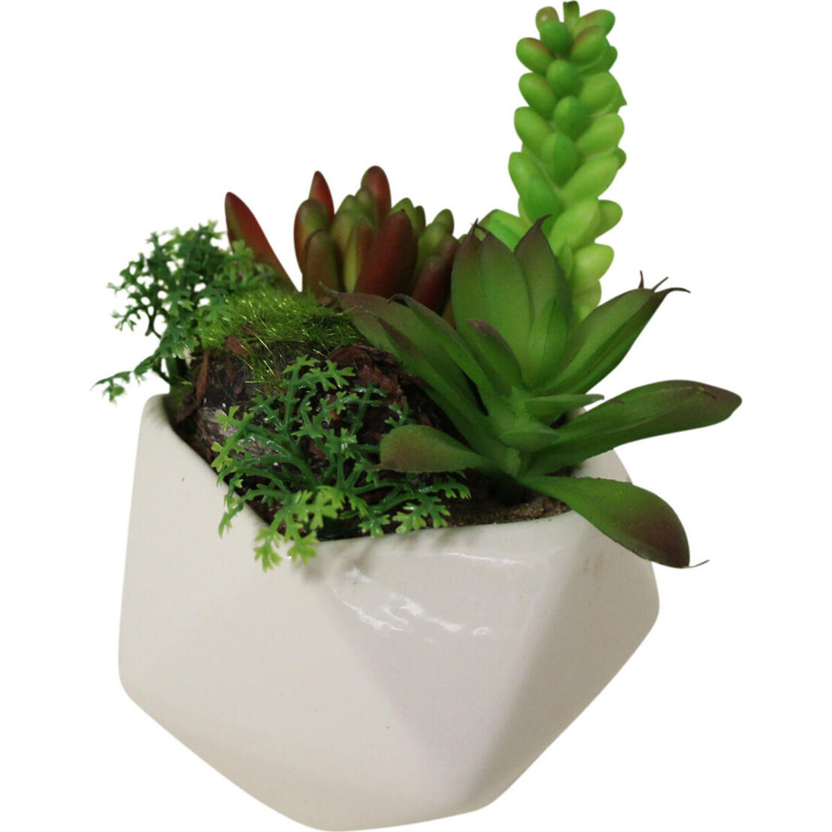 Delight your spaces with the addition of this green creation that has assembled all kinds of succulents in one ceramic pot. Made from high quality resin and plastic, the replication in terms of size, proportion , positioning of the various plants and the choice of combinations it has given in one single white ceramic pot is indeed a wonderful mix of a variety of succulents that blend in well with every kind of space - whatever maybe the décor. It brings in a typical freshness that comes with plant inclusions. The planter is faceted and the design off sets the beauty of the resin and plastic made replicas. Comes with sand and soil kind of base that lends a more authentic feel.