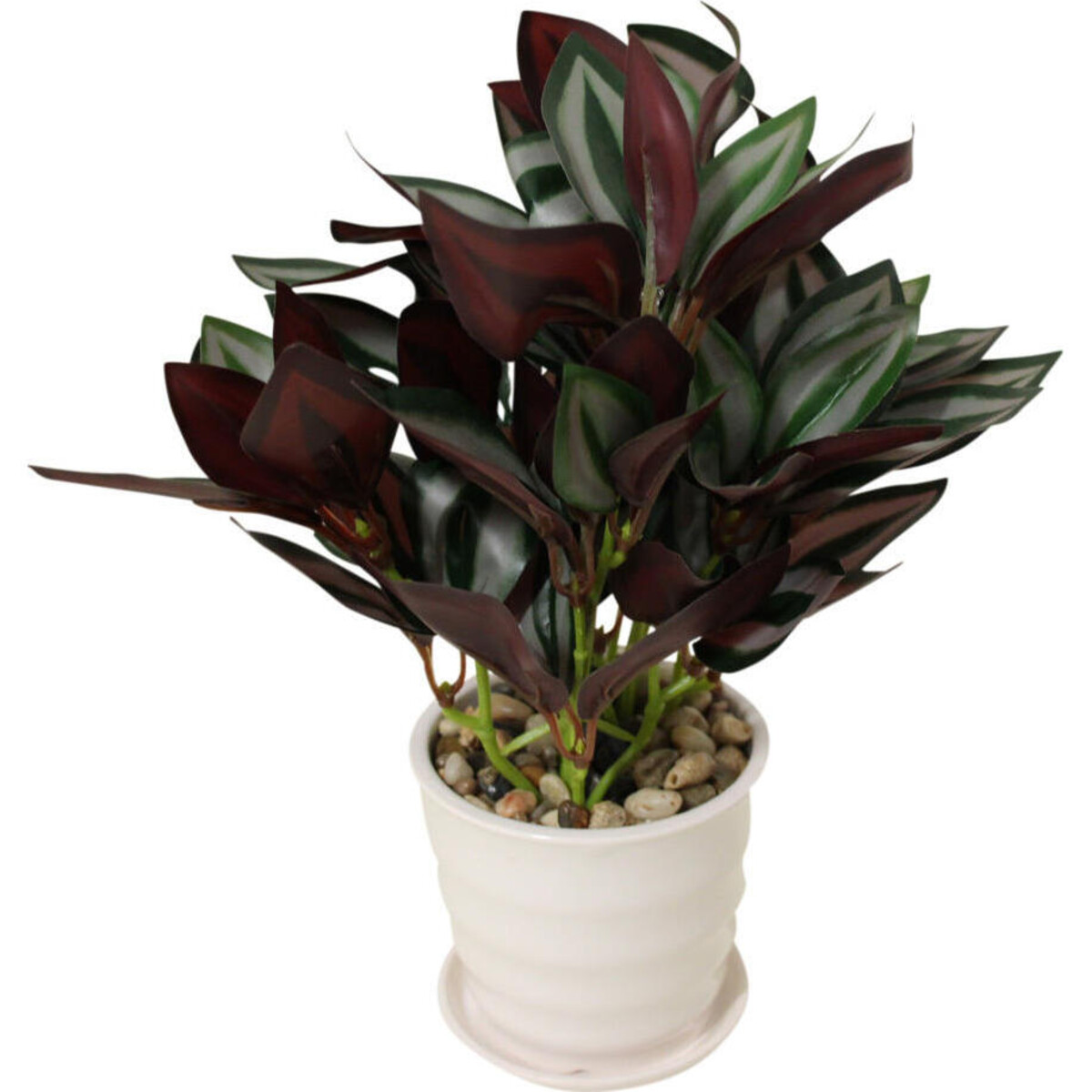 The wandering Jew rises up in multiple stems from a white coloured ceramic planter - its sap green stems with multiple leaves gives a lush kind of impression, the deep coloured maroon set off by the streak of ash coloured pattern on the leaf makes the natural beauty of the plant seem more dramatic. It is an easy to find plant that always manages to make an impression because of its pretty leaves and its ability to combine with all kinds of earth tones in the surroundings, if you wish to add it to the living room or the entry way of your home - or even that corner that needs a spurt of liveliness this would be your best and most well - chosen option. The stones that seem to be covering the solid in which the plant is growing out from adds to its authentic kind of appeal. The multiple leaves add to its dense and well - manicured look. A great option of you wish to remain fuss free and yet use plants that need no care. Can be simply wiped clean with a damp cloth to look as shiny and natural as ever.