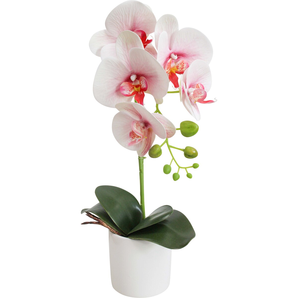 Bring a touch of elegance to your home with this stunning faux orchid in a delicate shade of pink. This lifelike orchid is the perfect way to add a pop of colour to any room without the hassle of maintaining a real plant. The pot is a compact 9.5x9.5x9.5cm, making it the perfect size for a windowsill, desk, or shelf. The total height of the plant is 31cm, making it an eye-catching addition to your decor.
