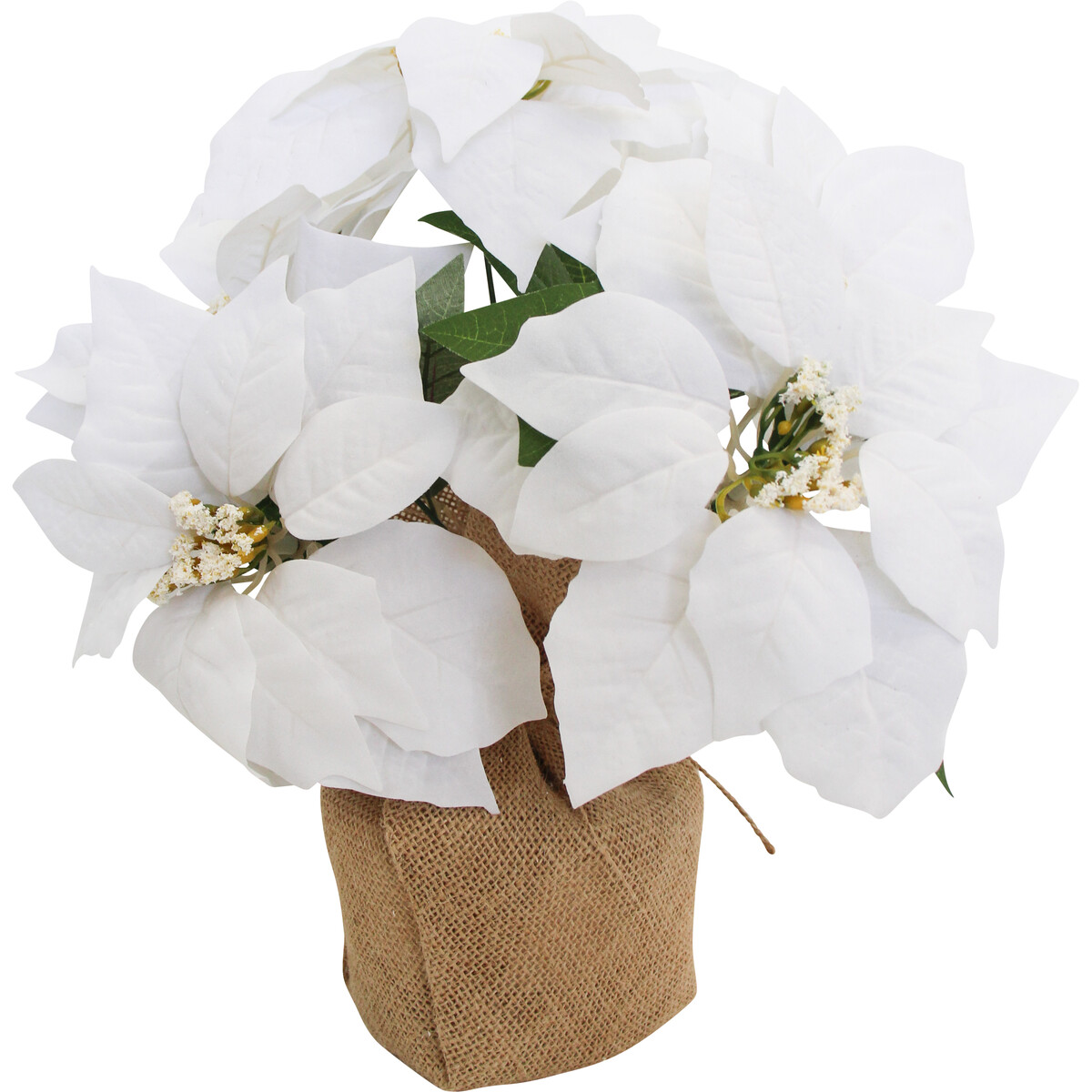 We’re always on the lookout for those products that you can place absolutely anywhere - homes, offices, or even a nice little reception area. Our Faux Poinsettia White Large is one of those pieces that just works wherever you put it. At 12x12x11 cm and standing at a total height of 38cm, it’s really the ideal size for a side table, kitchen counter, or even a desk. We think it’s something about those striking white petals paired with the sturdy jute-wrapped pot that makes it look both modern and timeless at the same time. It’s definitely versatile - we love how it pops against darker decor styles and adds a fresh, understated elegance to lighter interiors.    Because we used quality plastic, foam, and metal when crafting this piece, there’s no risk of it looking cheap or tacky - we kept the shape natural with just enough structure to hold its form beautifully all year long.