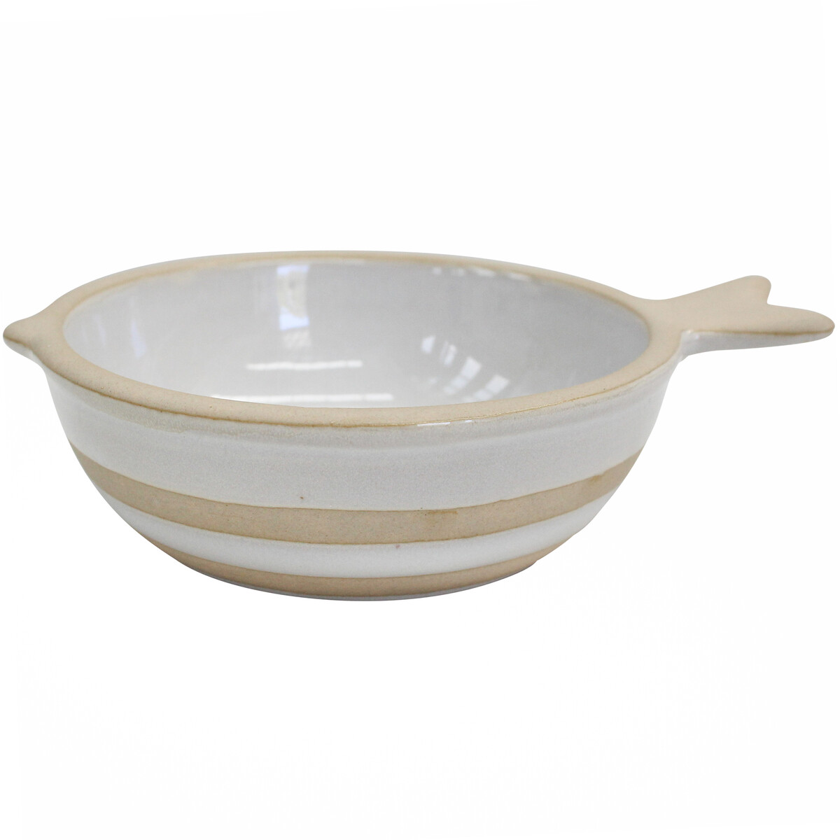 The sign of fine quality ceramic comes though hen you see that well defined sheen-the subtle colour usage and the details which only the discerning eye can spot. Here is a little blow using beige as its main colour palette, a tiny snout, the handle designed from its tail and an inner white complemented by the beige and white stripes on the outer body -all coming together in classy and sophisticated piece. Use it on your dinner table, place it like an accent if you please topping it with shells and pebbled from the beach -it’s going to gather a great deal of attention for so many reasons. It’s dainty yet sturdy with a 3 cm depth and sits well balanced on its round base. The diameter is all of 11.5 cm making it large enough to be used as serving bowl.