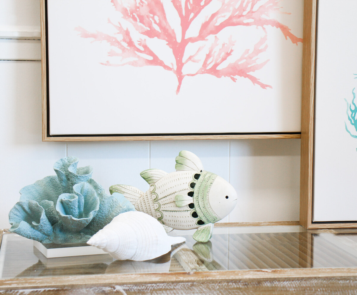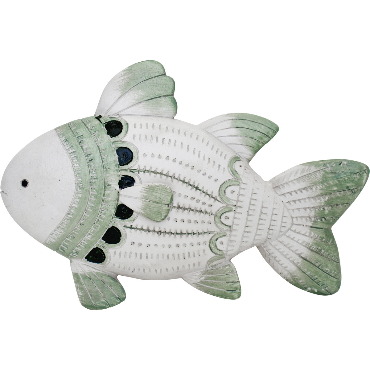 Crafted from polyresin, this little fish balances well on its tiny fins at the bottom. It is all of 21.5 cm in length and about 15 CM in width making it quite impressive when it comes to size. The uniqueness also lies in its pattern and colour. The touch of an artist's imagination shows in its colour and pattern. Hand painted design in grey and blue on the white pack shop as to its fresh appeal. Certainly not your commonplace fish this one comes with a completely new look- its tribal appeal fitting into the boho chic look you want in your faces. Made of polyresin it is sturdy, cleans up easily with a damp cloth and will continue to show off its pretty colours day after day. You could add other marine life around it to make a grand display.