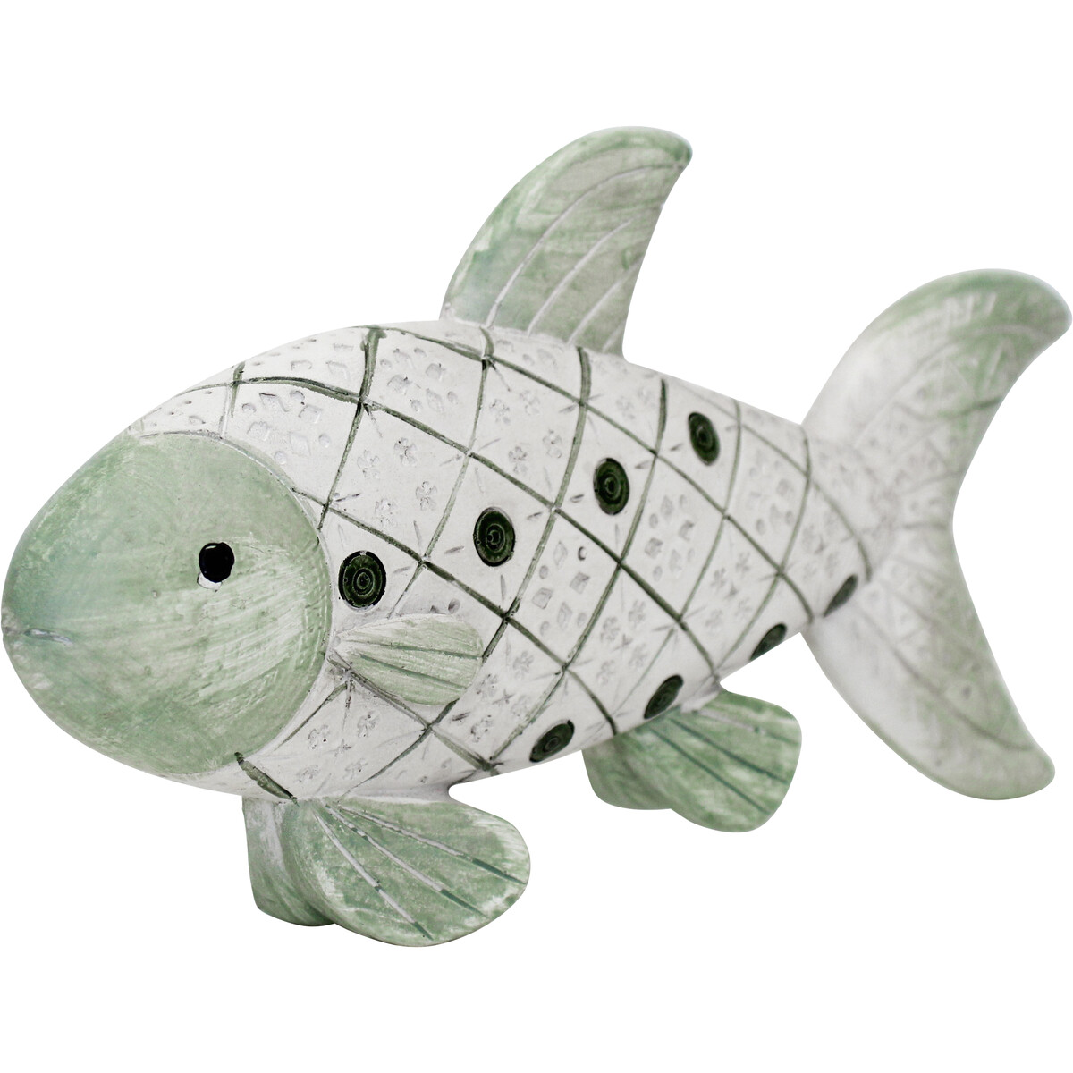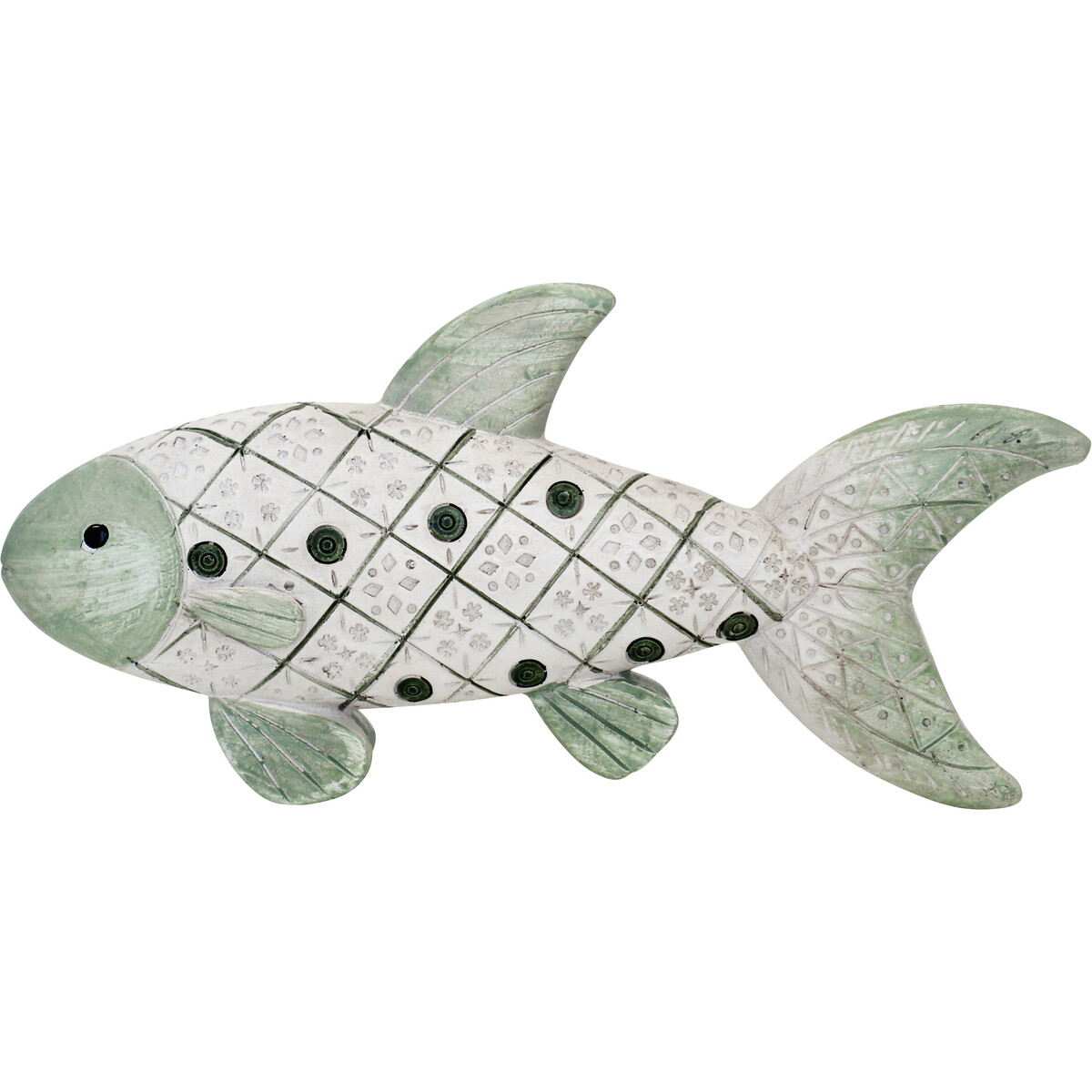 Oh, this one is always a bit of a conversation starter - our Fish Decor Mareena NEW. It's made from polyresin so quite durable - and that white and green glazed wash has a slightly rustic feel, but it’s not too aged for modern homes either. We like the quiet hand-made character, personally. It measures 23x4x10.5cm so you can display it on a console, on a coffee table with some candles nearby for a gentle beach house feel - or on a home office shelf for that relaxed but professional look. And we know customers love artful pieces that still feel accessible. It works for coastal decor, Hamptons, even French provincial if you pair it right.