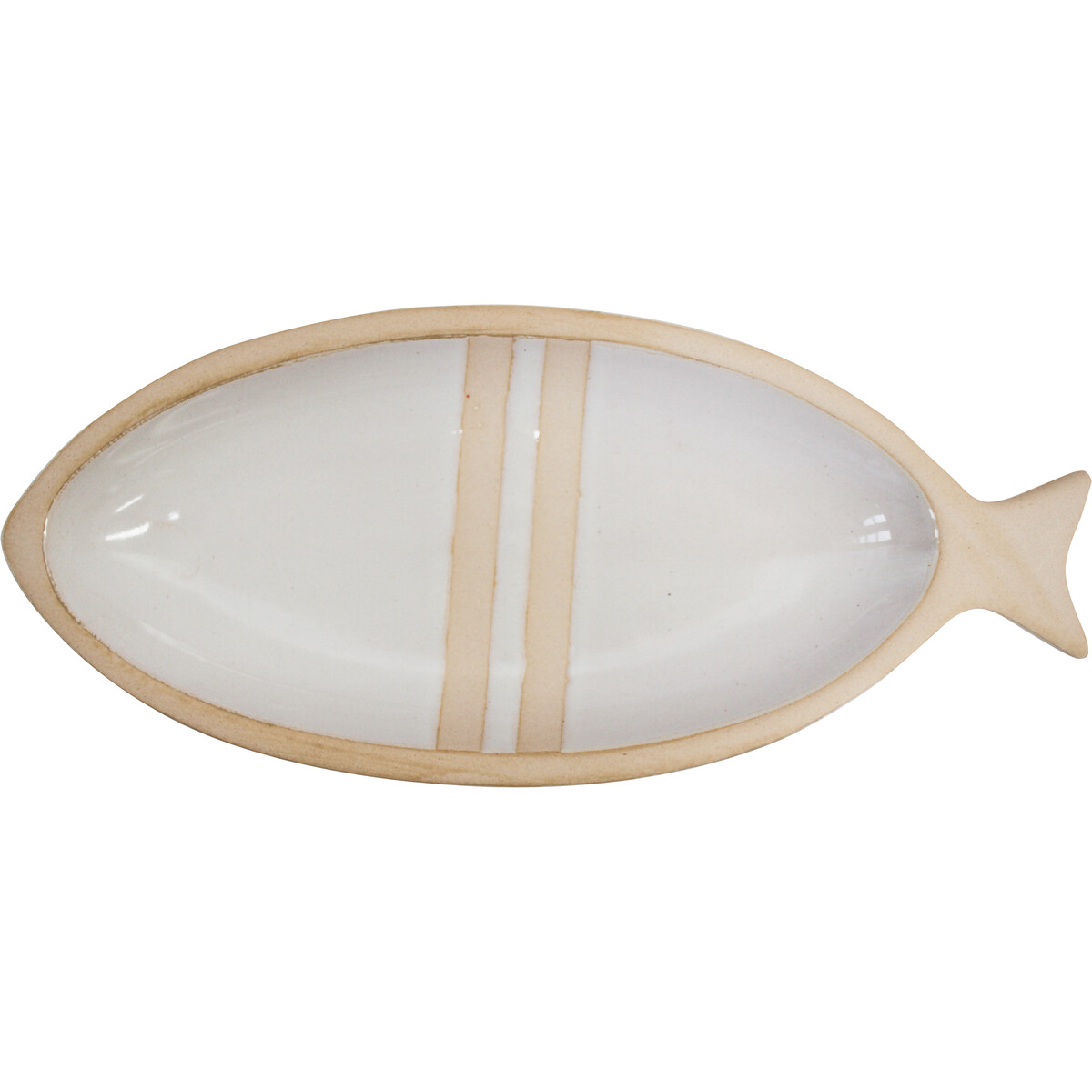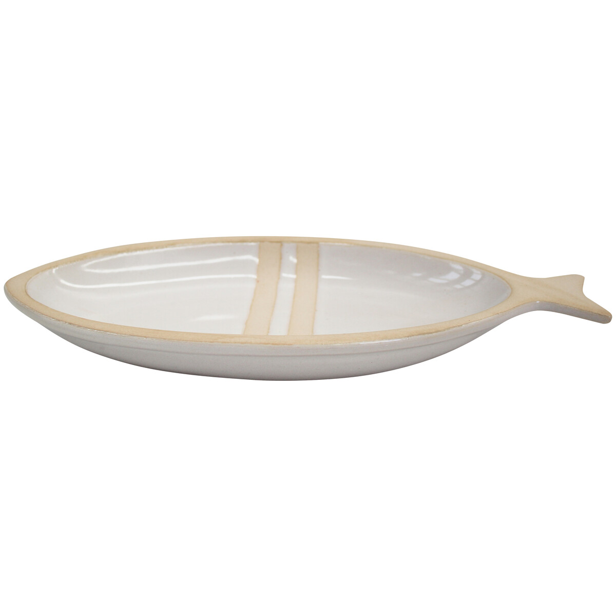 When considering the right kinds of bowls and platters for your serve ware, bring in fresh new vibe wit this marine inspired set from Lavida. Pearly white ceramic gets a whole new meaning when combined with the most delicate of beiges to create a fine serving experience. The delightful combination of subtle colours when given the kind of sheen the ceramic has been given adds to its classy elegant look. About 22 cm in length, the platter is oblong, imitating the space of a fish with its tail jutting outward in prominent manner. The depth at 2 cm and the base, both help in giving the platter a well-balanced look. The edges wear the beige colour as if it has been hand painted. Complete the pristine and fresh marine look on your table on special occasions and for making everyday meal time feel special with its inclusion.