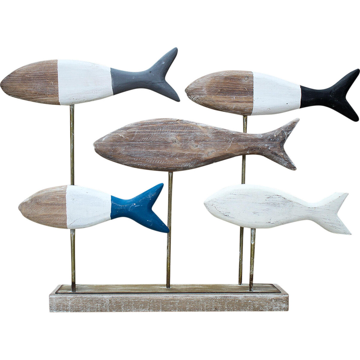 Bring to your marine themed home the beauty and wonder of the under water world with this fish on a stand creation that is rustic chic and in keeping with the kind of shabby looks that modern homes would love to aspire to. Made from metal and timber, it features fish in various sizes, painted partially, some showing off their distressed colours and wooden selves off-they all overlap one another thus adding a depth and dimensionality to their display. Place this on side boards corners or some such pale that needs a definition. The handsome showpiece is all of 44 cm in height and it spans 61 cm in width. The stand is made of wood and allows the fish on spoke-like rods to look their best. Add some more marine sculptures and lots of whites and blues to give it a perfect setting to revel in.