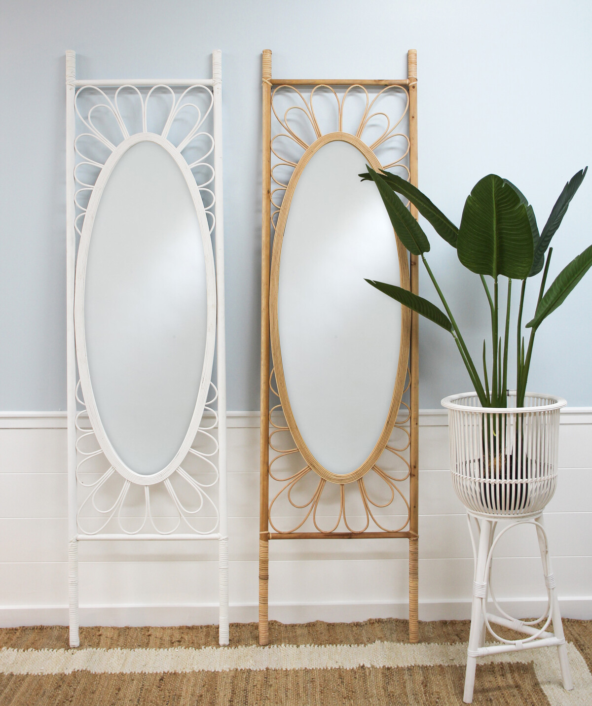 The delicate traditional rattan cane design which frames the oval shape of the mirror makes it look rather ornate in a bohemian chic way. Use it in your own bedroom, and if you have a bathroom large enough, it could be placed there- and if you'd rather have it in the guest room which feels a little cramped, a mirror like this near the window will make things look brighter and more open. It has the versatility to be placed on the wall or simply be placed on the floor. Stylized in a way to fit into modern spaces-helping in opening them up and making them feel more spacious.