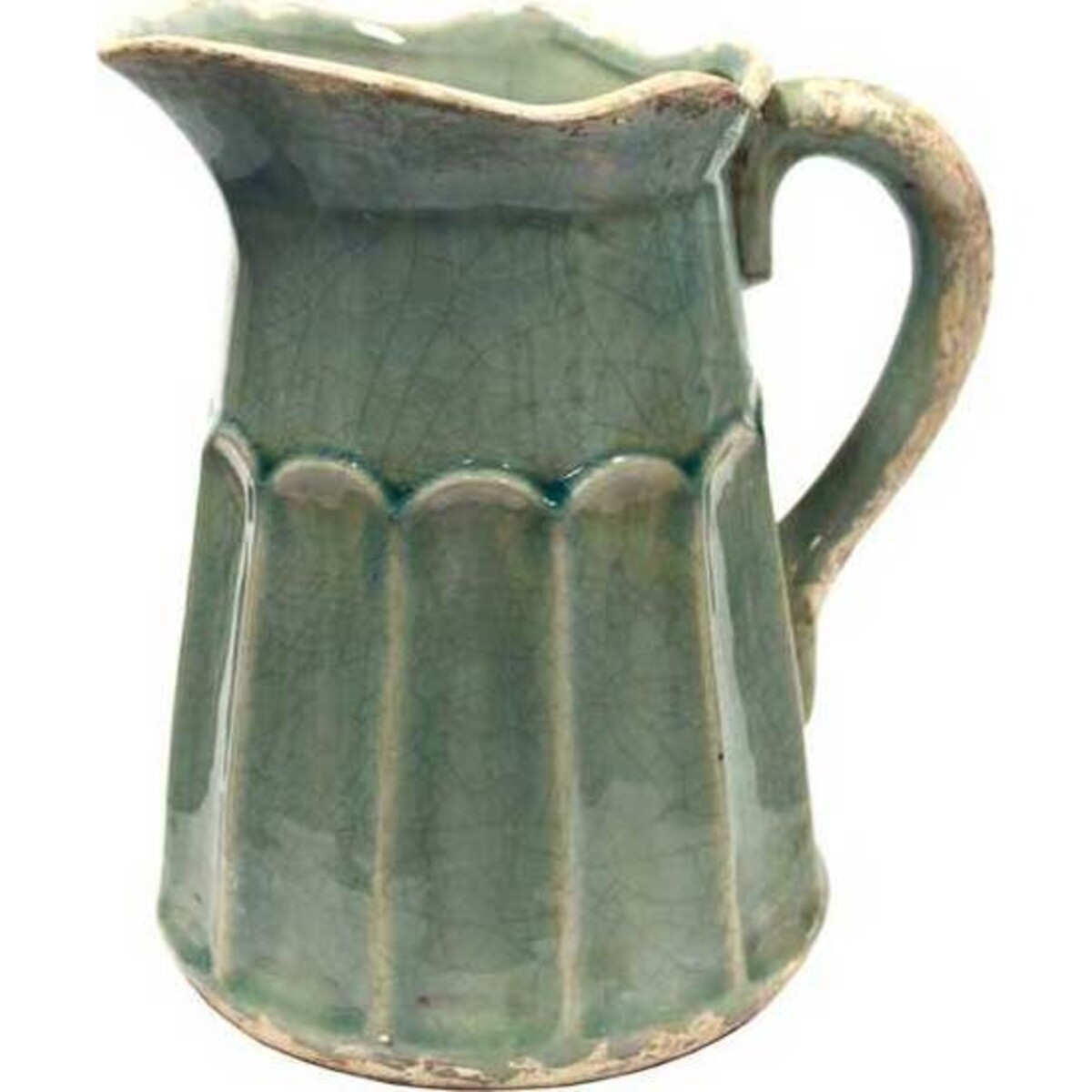 The bottom is wider compared to the mouth, like most jugs. What makes this special is the flute like design on the mouth. This is possibly decorative but it also makes pouring drinks easier. Another design element incorporated are the petal-like carvings covering the lower third of the jug. A simple, C-shaped handle on the side is attached. It is painted a very light teal.