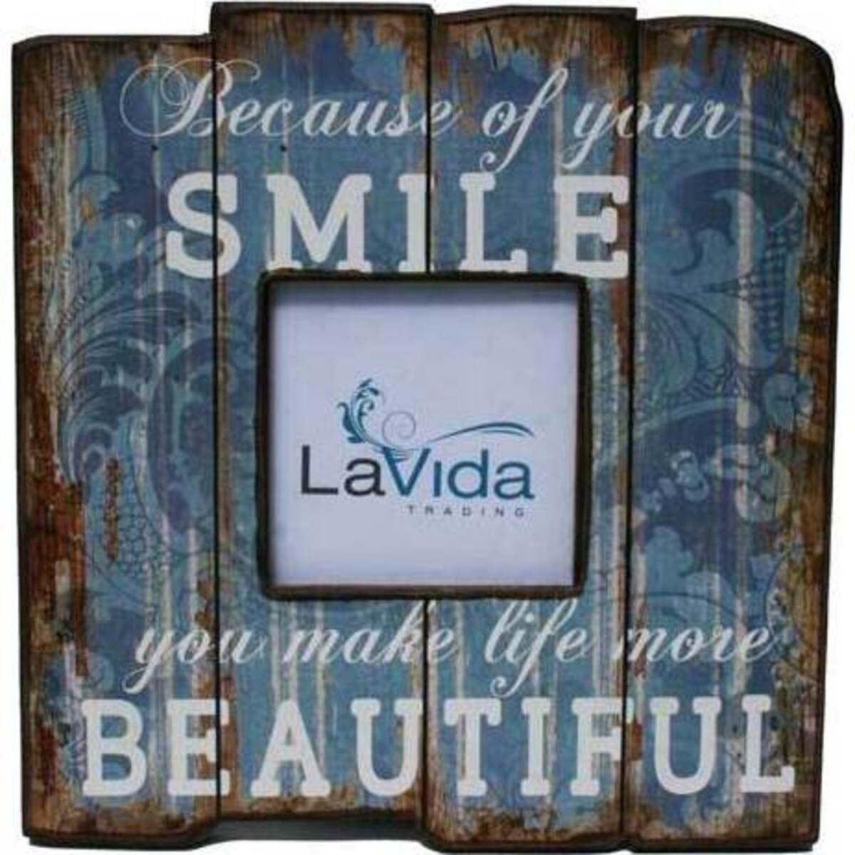This picture frame is highly decorative and functional with its solid construction and natural design. In the style of vertical wood slats, similar to fencing, the background is beautifully styled with intricate patterning on the surface. The edges are rough and aged, giving a strong texture and leading the eye into the central message and framed image. The message is romantic and relating to the picture, "Because of your SMILE, you make life more BEAUTIFUL". A gesture that is sure to thrill the recipient and making this a wonderful gift idea. At 21 x 22 cm, the frame is compact enough to be of practical use in the bedroom or living room, and the design is relaxed and informal, further adding to its appeal, and heart-warming message. The shades of blue and brown, cool and comforting, will enable the frame to mix into many settings without clashing.