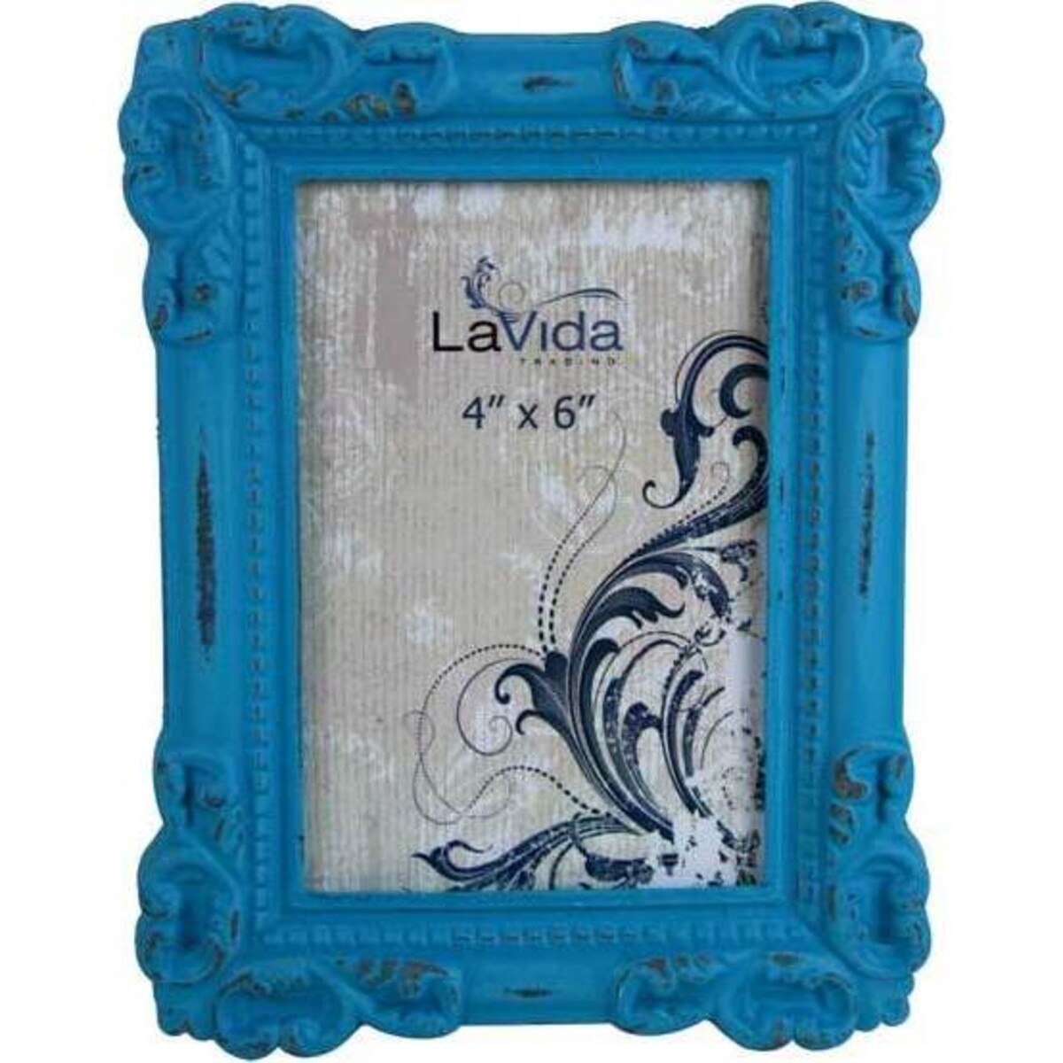 A once - traditional picture frame, the Frame Belle Blue from LaVida gets new life with a coat of vibrant blue paint and ample distressing for character and shabby chic style. This wooden picture frame features elegant carvings in the tradition of Old World architecture, which contrasts with the bright hue of the painted blue finish. The finish shows generous amounts of wear for a worn, vintage look. This frame is one of several brightly coloured picture frames by LaVida and would complement black and white photographs without detracting from their subjects. A glass insert in the frame protects photos underneath.