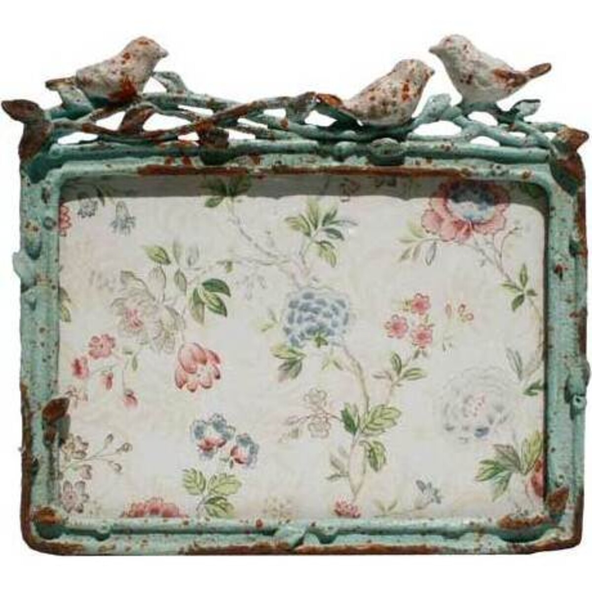 A quaint, aged picture frame with floral patterning and birds nest above.