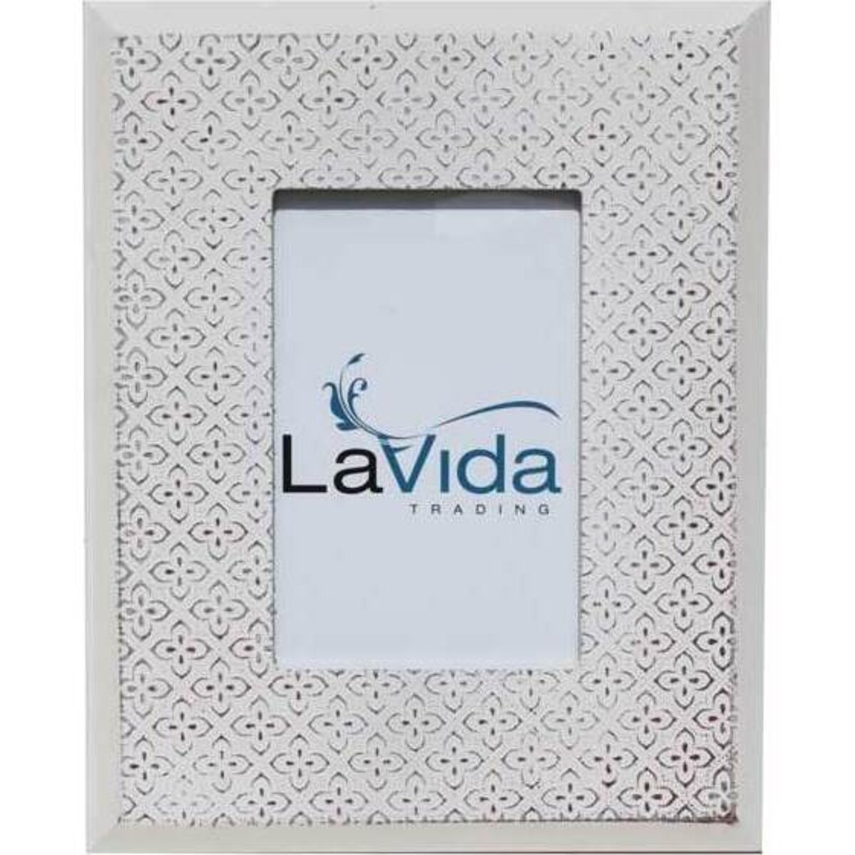 Take a moment to address the beauty of this simple, cream coloured picture frame. Made out of wood, the frame consists of a flower - like pattern traced throughout the border. The ombre effect that appears in the frame gives off an antique vibe that would look beautiful resting against an old lamp or on the mantle near a Victorian fireplace. The solid white border that surrounds the entire frame draws attention to the design without taking away from the photograph itself, which is encased in a 4x6 inch area of the frame.