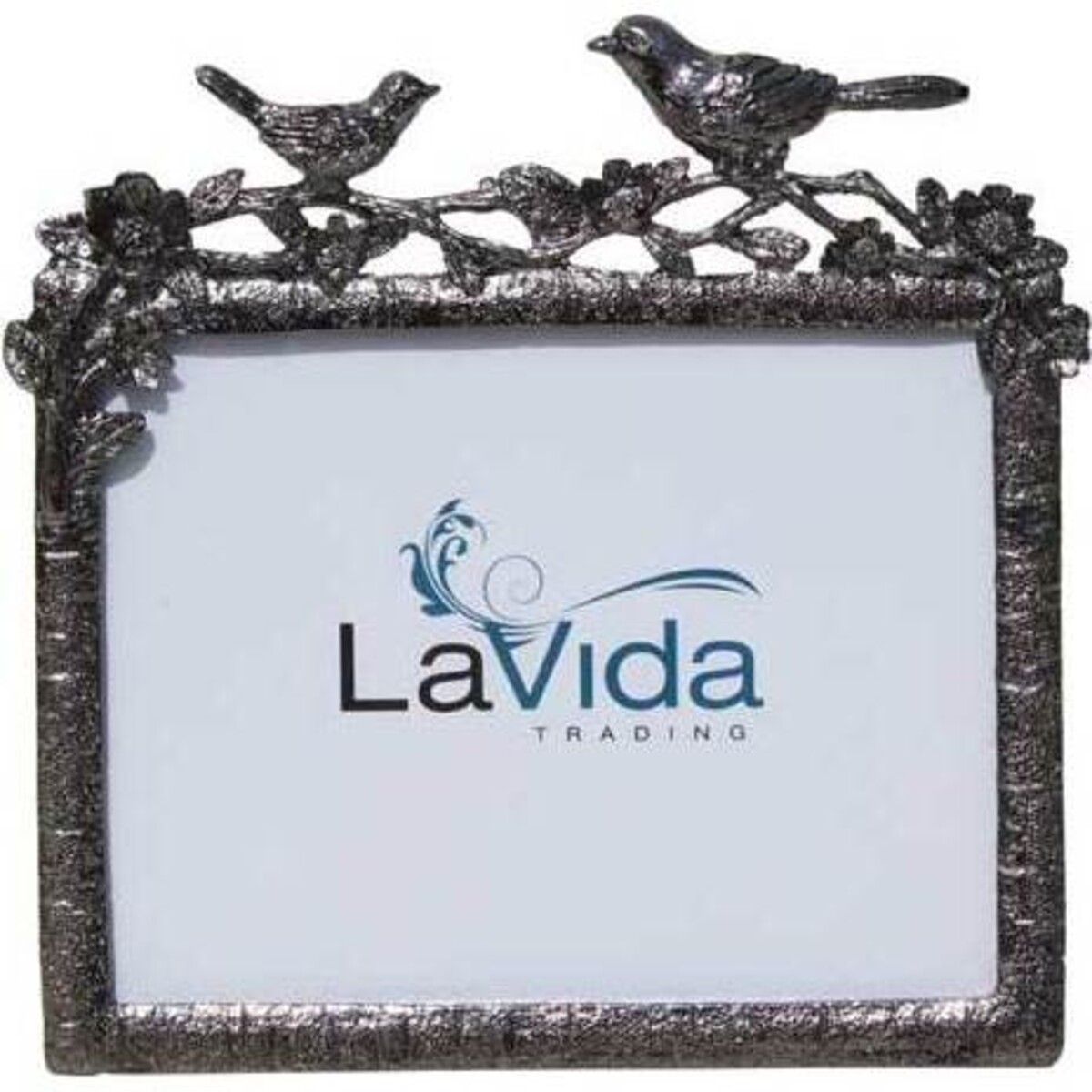 Add a majestic touch to any room with this small, forest - themed, picture frame. The horizontal design is perfect for landscape pictures or family portraits. There is something about the way the light hits this dark metallic picture frame that illuminates the border and really makes photos pop. The textures frame features a tree - like base frame with birds resting on top. The birds that face one another rest on top of a branch design that contains leaves and flowers, almost like a garden. Placed by itself or surrounded by simple frames, photos will pop and eyes will be drawn not only to the beautiful frame, but also to the picture it surrounds.