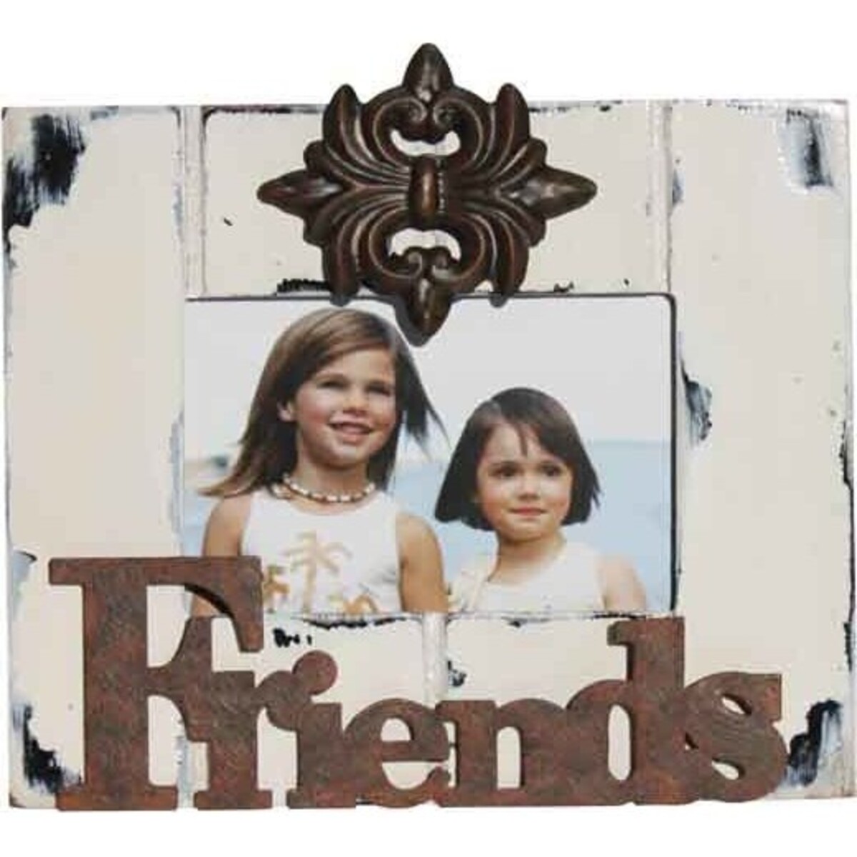 The tiny section in the middle where the photo is placed is embellished with artsy components. The bold text FRIENDS is set at the bottom left of the frame running to the middle section. It has contrasting burnt red shade. The renaissance inspired emblem in dark brown at the middle upper part of the frame finishes the artwork.