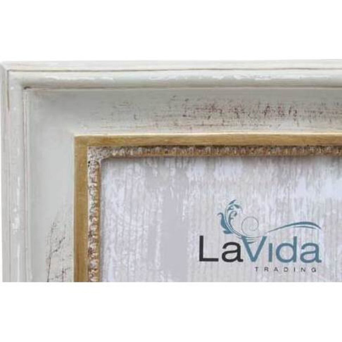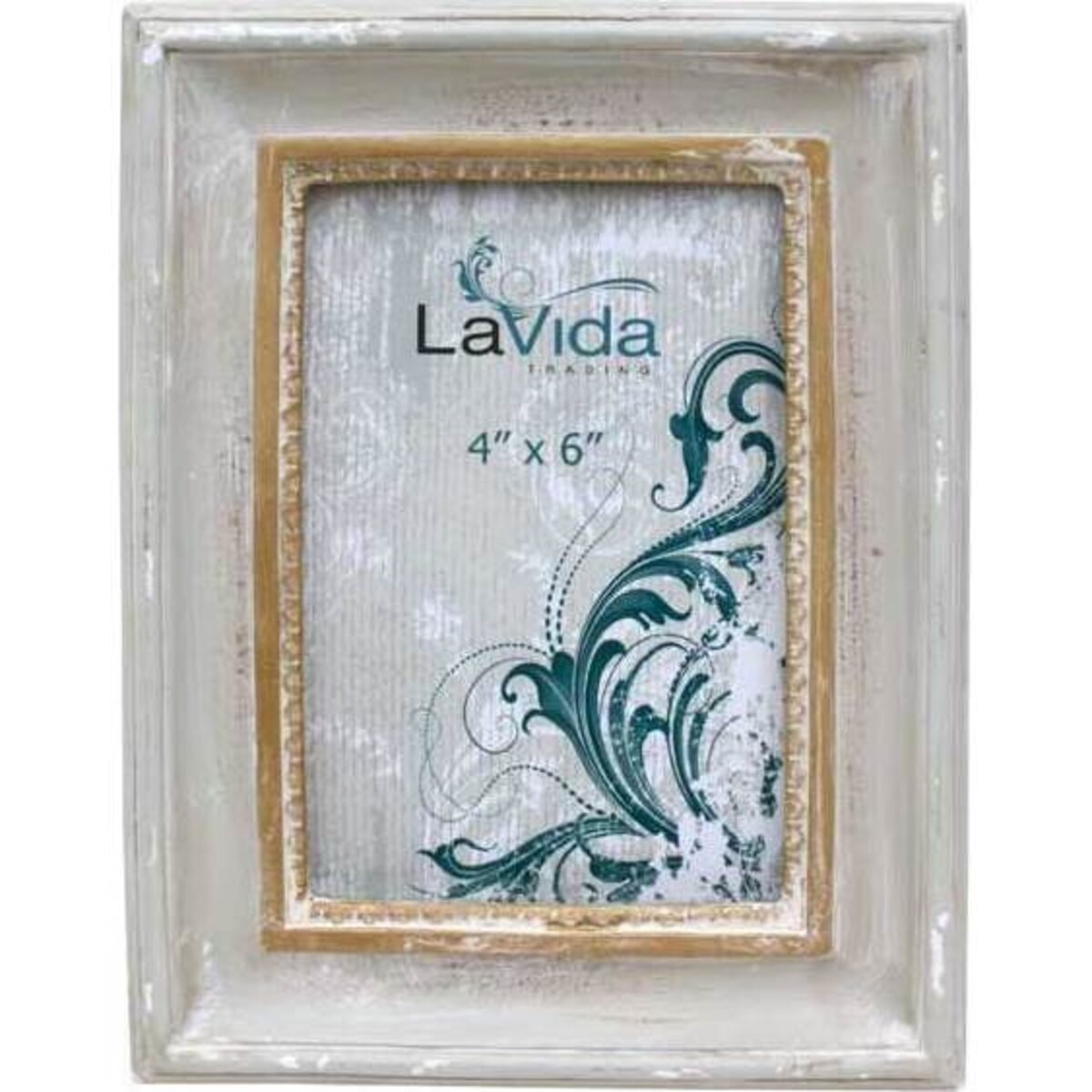 Whether it's antique, classical, or modern, shabby chic is a style that can be part of an eclectic combination of furnishings and collectibles. • Rectangular shape can be grouped with other shapes and sizes to create a beautiful montage on a wall or shelf. • White washed finish is distressed to give the frame a vintage appeal. • Half round molding on the outer edge leads to a concave interior frame • Inner edge is painted antique gold and has a repeating geometric pattern Frames are often picked up as last minute gift purchases so be sure to display them across the store in home furnishings or home goods, giftware, and accessories. Use them in lifestyle settings and to accent furniture.