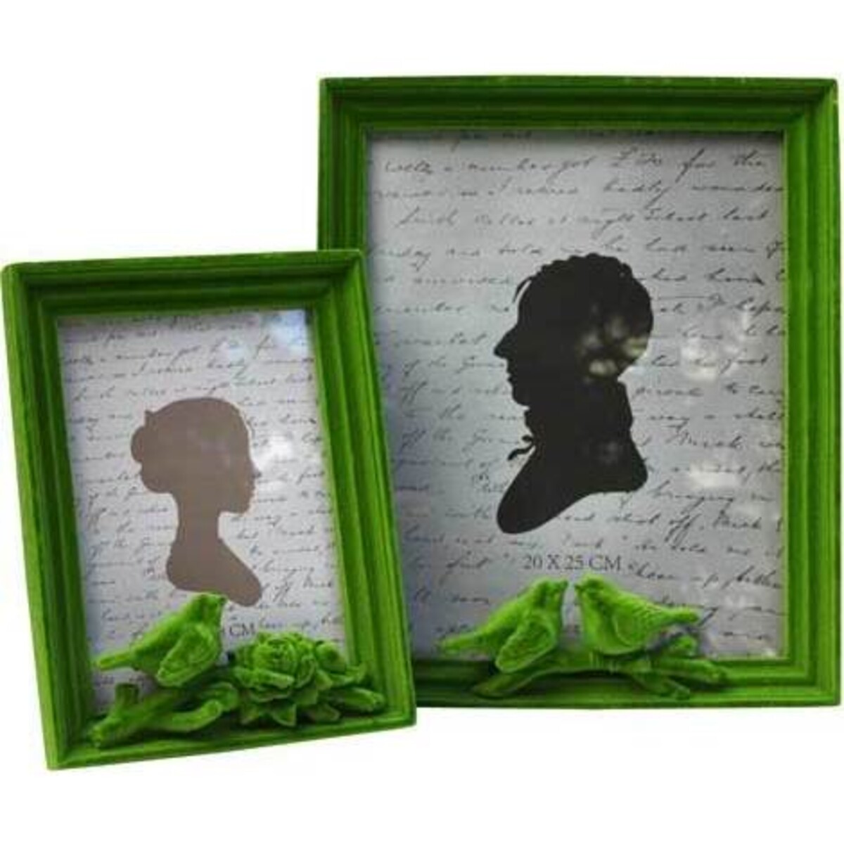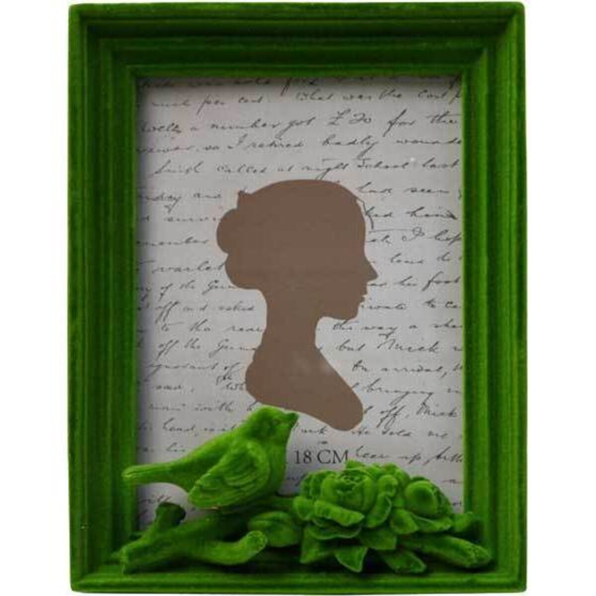 The total size of this exotic small green frame is 16 x 21 x 5 cm. However, the actual frame size excluding the border is 5 x 7 inches. The size of the frame is big enough to display group photographs or family pictures. The border is a rich velvety emerald green colour. The colour of the border is so beautiful and opulent that it brings out the best in any picture inserted inside it.The frame is vertical with a bird perched on a branch at the bottom of the frame giving an aesthetic and natural feel to the frame. The frame can be placed in bedrooms, living rooms, halls etc.