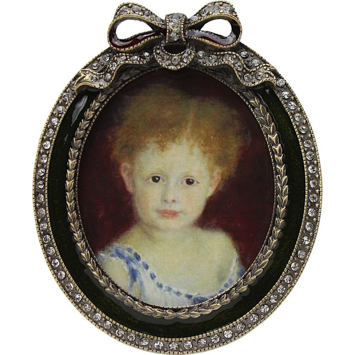 This oval picture frame is margined by intricate details and encrusted with brilliant white stones all around. It also has a bow tie ribbon on top with flowing laces, making this charming little piece look all the quainter and antique.