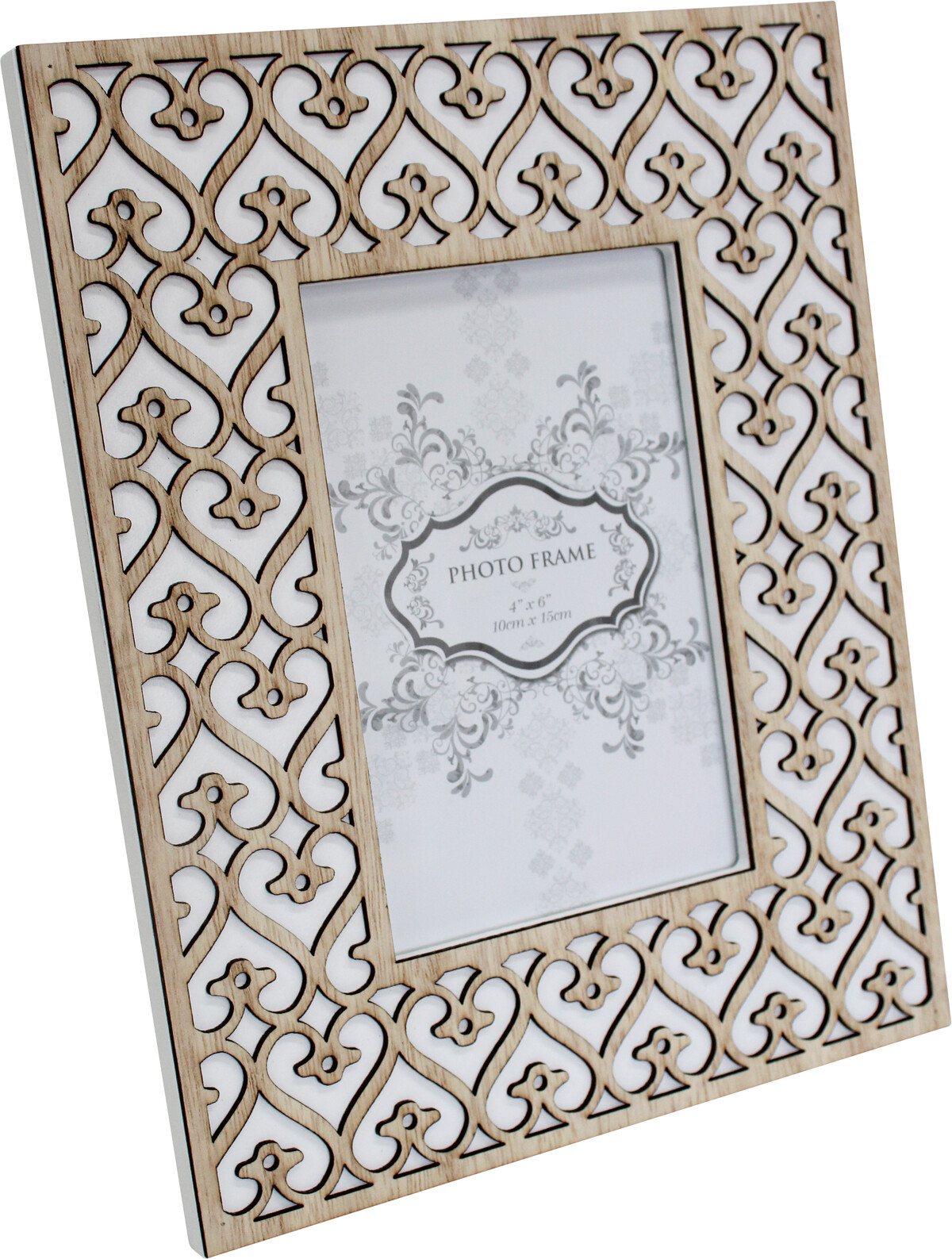 Artfully made through the use of premium quality medium density fibreboard material in a dimension which measures 19 centimetres in length, 24 centimetres in height and 1.5 centimetres thick, this Frame Heart 4x6 Nat is a natural themed picture frame that is ornamented through the use of love motif. Artfully carved out on the surfaces of this picture frame are several love shaped symbols which will give more depth and decorative appeal to every picture that will be inserted in the glass enclosed section.