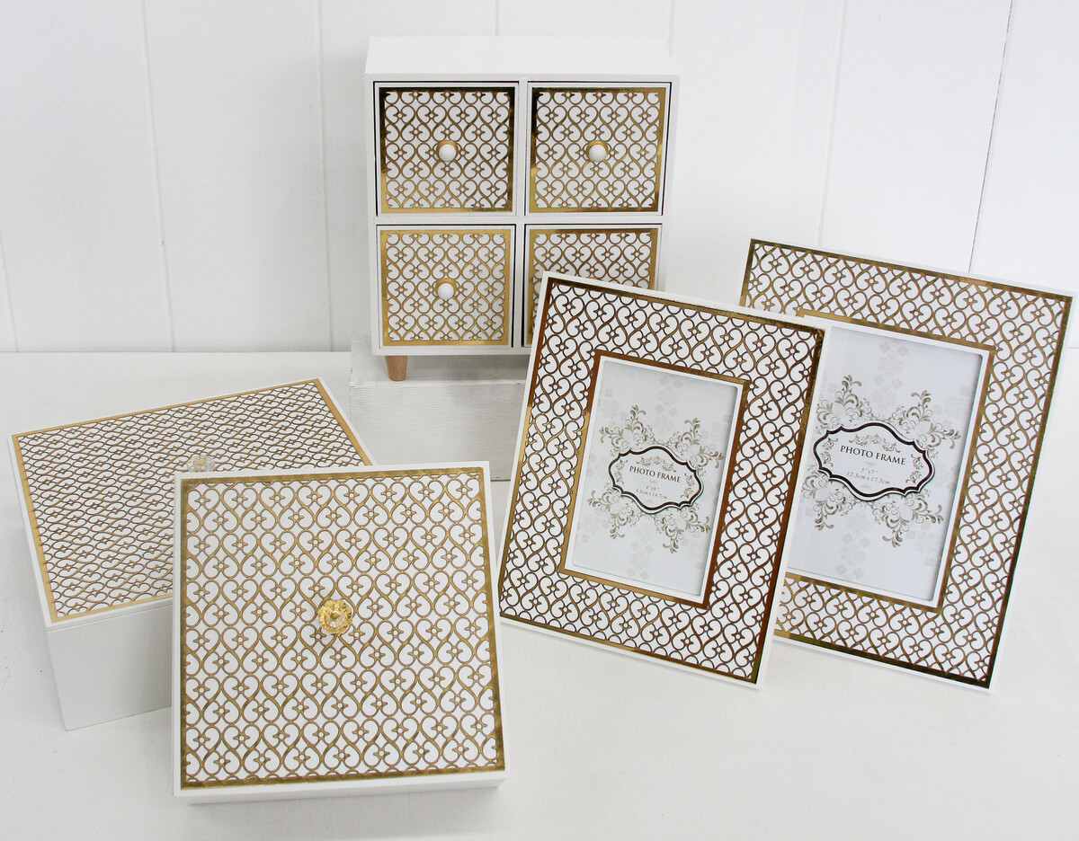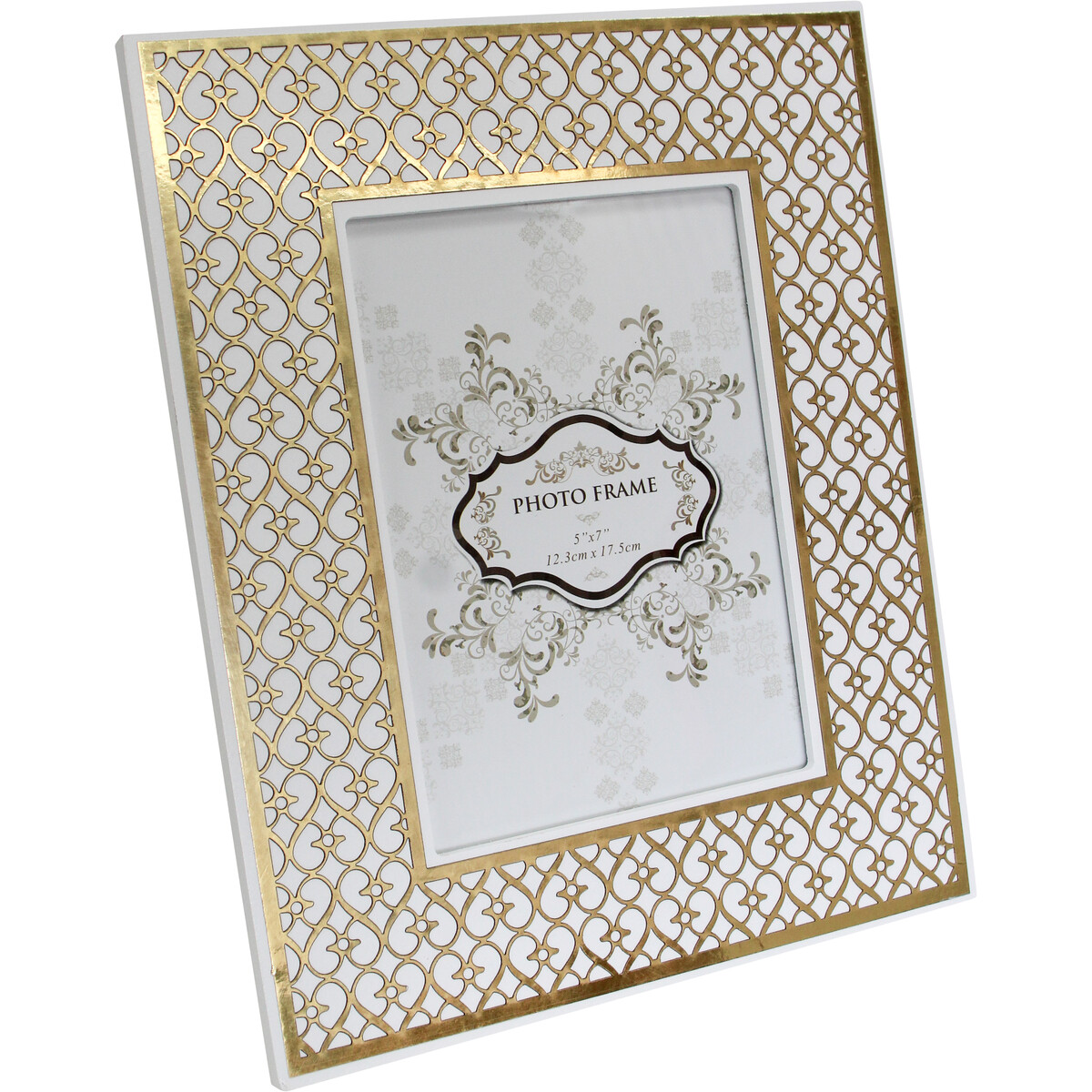 Crafted using high grade medium density fibreboard material and then having its cut in picture slot enclosed using premium quality transparent glass, this Frame Lustre 5x7 combines quality, lustre, convenience, durability, aesthetics and practical functionality. Other than the cut in white lacquered centre which is demarcated with shining gold lining, the surface surrounding this centre is artfully ornamented with lustrous gold coloured patterns which run all through the surface. The edges and back is luxuriously painted in immaculate white hue.