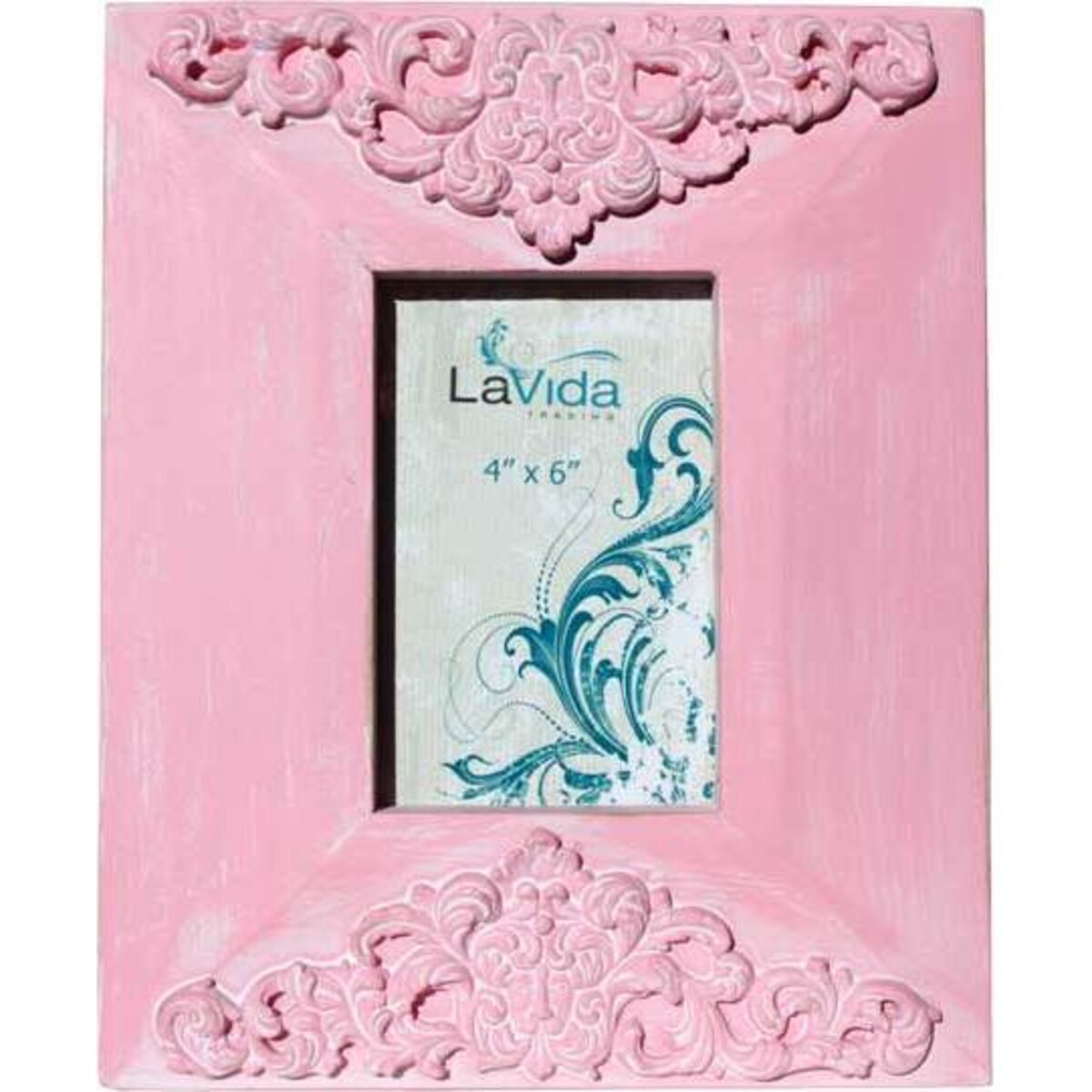 This pink frame features an elegant scrolled design set in a triangle formation on the top and bottom of the frame. It has a washed finished to give it a weathered and worn appearance, as if it's been used and well-loved for years. You'll look for any excuse to use this frame. It has a huge girly vibe, but it's something you could use in your child's room or even in your room. The frame is beautiful enough to keep for yourself, or to give as a gift for any occasion.