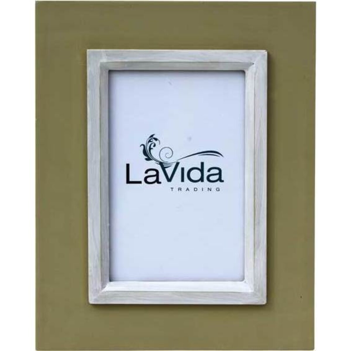 The traditional 4x6 inch frame is nothing new to the tabletops of homes, but the modern design of an army green frame certainly is. This wooden frame features a small slot for a simple photo and three, tri - coloured borders that surrounded it. The thin, cream - coloured wooden border that surrounds the picture itself juts out from the remaining two borders, drawing attention directly to the photo it surrounds. The army green, almost moss coloured, border is drawn out beautifully by the bright white border surrounding it. All three borders blend together perfectly and add a modern touch to any room or piece of furniture it graces.