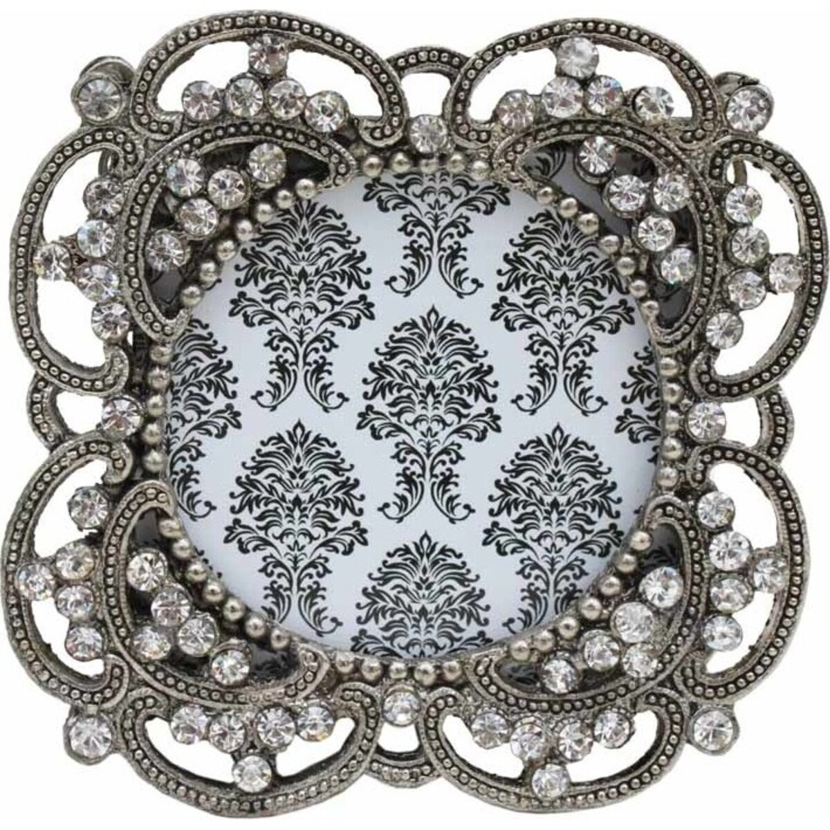 Treasure your favourite memories in a diamonte frame. A small round frame such as this was at one time commonly seen decorating many parlors and sitting rooms. One could also picture it in the more intimate setting of the bedroom, decorating a nightstand, vanity table or chest of drawers. It gives a portholes view into a singularly important photograph or piece of art. They are ideal for displaying pictures of loved ones, wedding photographs, baby pictures, and sentimental occasions. The outer portion of the l frame consists of a symmetrical pattern of loops and swirls. Shiny diamond-like gemstones peek out from the folds of the design. The lining of the frame is lined with a black and white pattern of fleur de lis that is stylish enough to display even without a photograph covering it.