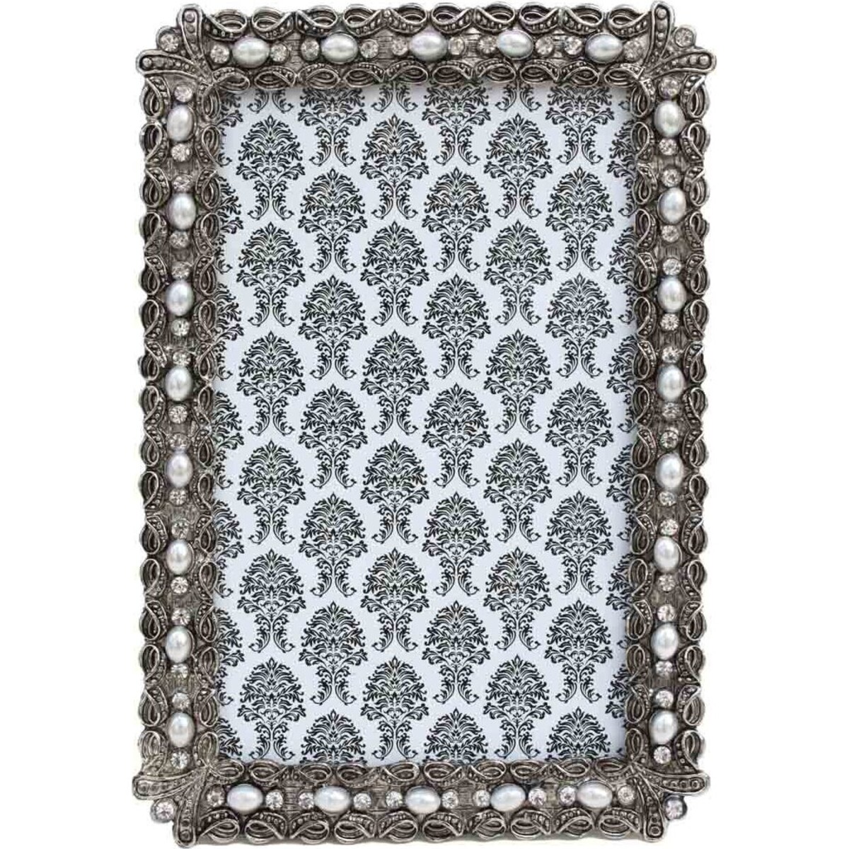 Most rectangular picture frames basically consist of rows of boxes that lie within one another. This frame has three such boxes. The outer and inner edges resemble the curves of ribbon woven together in an even formation of loops. Between the ribbon patterns is another row of alternating faux pearls and diamonds. The lining of the frame is lined with a black and white pattern of fleur de lis that is stylish enough to display even without a photograph covering it. These frames look elegant and inviting decorating the side tables of parlors and sitting rooms. One could also picture them in the more intimate setting of the bedroom, decorating a nightstand, vanity table or chest of drawers. Treasure your favourite memories in a diamonte frame.