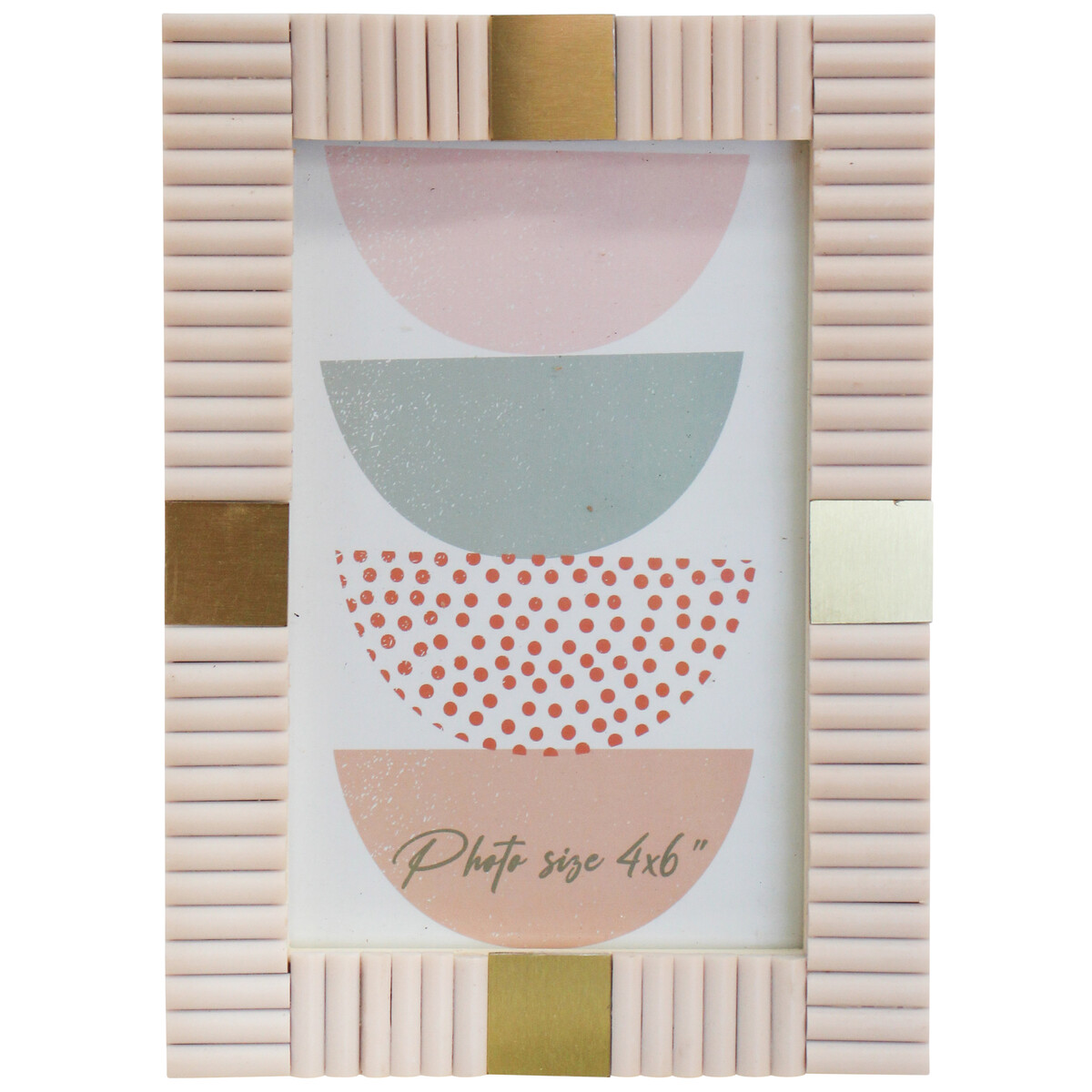 Here’s the thing about our Frame Roman 4x6: it isn’t going to blend into the background. We designed this one because we wanted something that was modern, textural, and a bit different—but not so out there that it would put off customers who prefer muted tones and classic shapes. This frame is made from acrylic and MDF, but it actually has an almost ceramic look when you see it in person. That ribbed effect on all four sides really catches the light (we couldn’t stop spinning the sample around our showroom). It’s finished with gold-toned geometric inserts, just to break up all those stripes and add a little hint of metallic sheen.