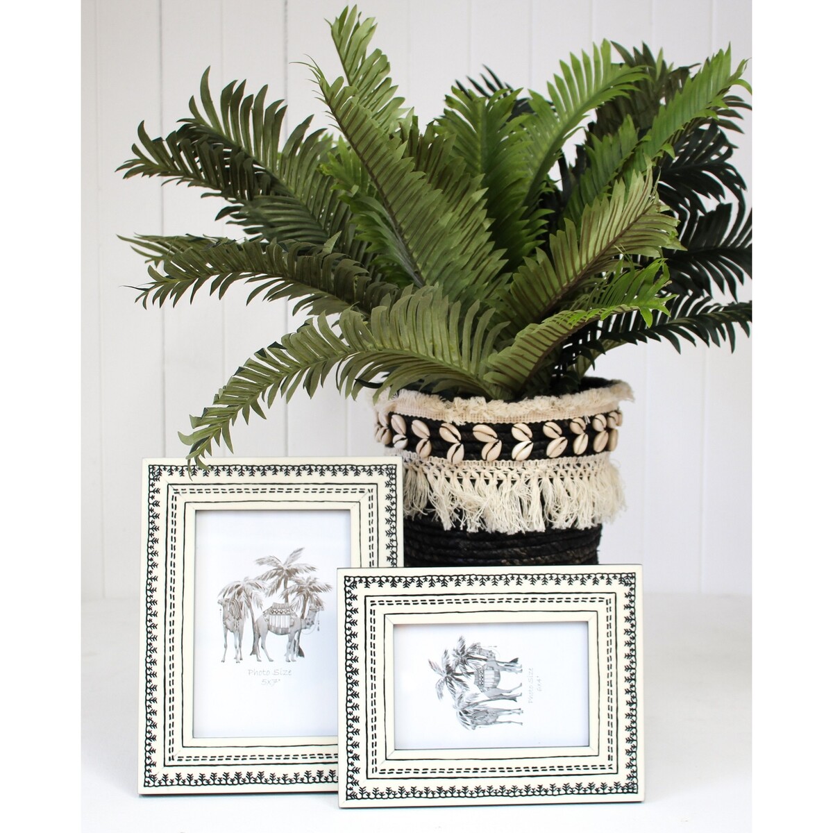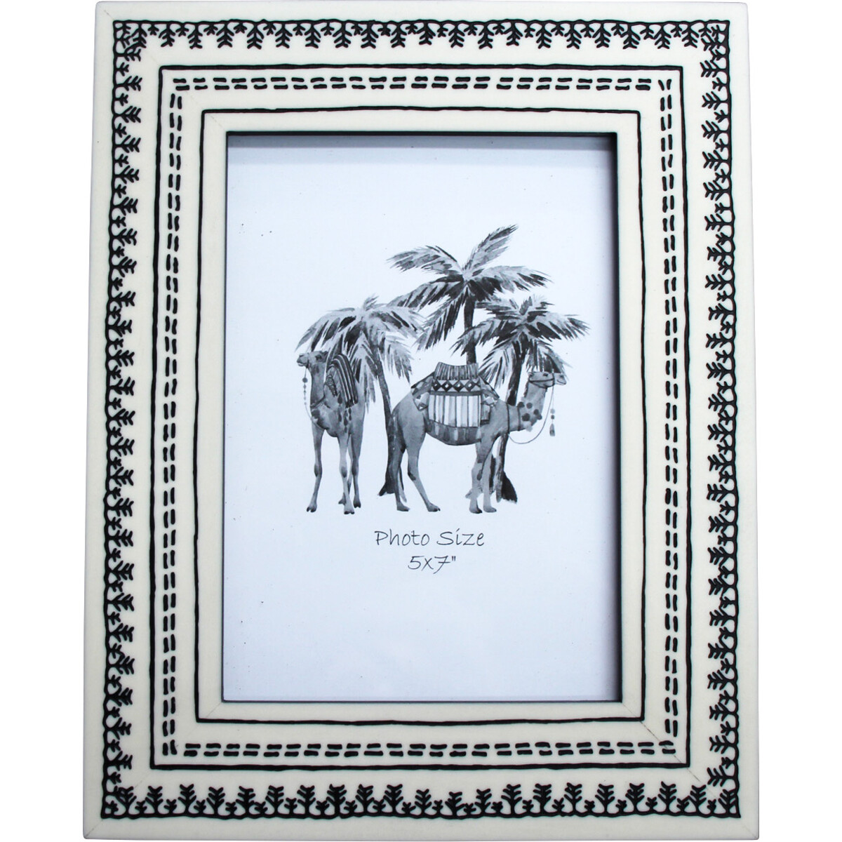 Especially dedicated to honour Mother Nature, it would have been rude if the designs on this frame were to be machine painted. This is why each and every piece of the Tribal photo frame is beautifully hand-painted. Each piece has a beautifully drawn motif with three layers of deign. Outlining the wall of the first layer of design are the paintings of big and small trees arranged one after another all-round the frame. At the second layer of design which has a boundary marked off by a single, black line are two short lines that are placed parallel to one another round about the frame. At the third and final layer of design is another black boundary line after which all that is left is whiteness. The black stencilled design stands out over the immaculate white background. This frame is designed for 5 by 7 inches photographs.