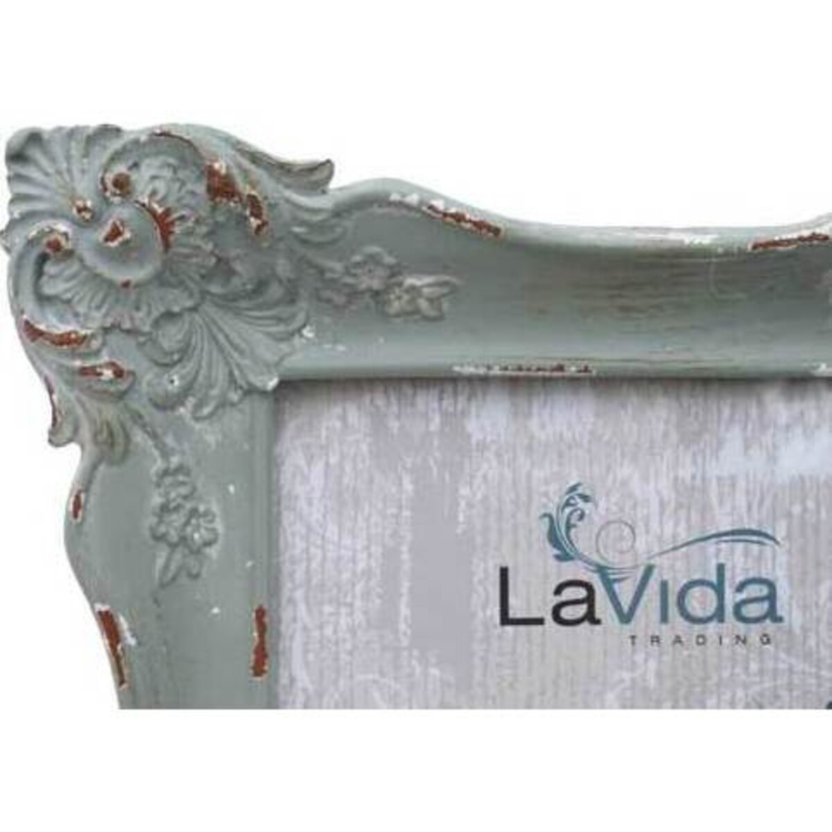 This is an authentic looking reproduction of a frame that has achieved the patina that comes with age. The fine soft blue-green paint has been expertly distressed to give it an aged appearance, with the same look of naturally oxidized copper or brass.