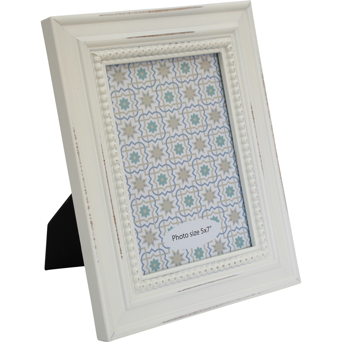 Be it your console or your desk at work-a great looking portraits always makes an impression -helps make the space more personal and lends a soft relaxed feel all at once and when you have a great looking frame to help create this display , you have half the job done, crafted from pine wood , washed in white colour with little shabby streaks here and there, this 25 cm high and 20 cm wide frame will hold a picture that is 7 inches tall and 5 inches wide. The backrest does amply well at holding this solid frame well balanced. Makes an impression as much with its own shabby styling as with its delightful white colour and ridging. Could be used for a wall display as much as for table tops ones.