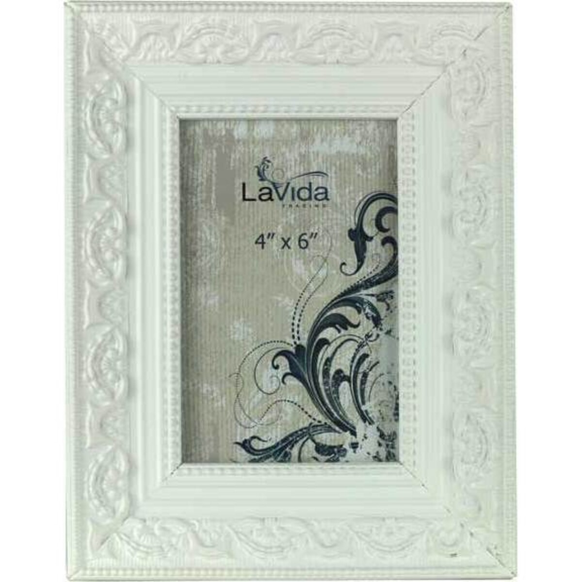 The picture frame has a gorgeous intricate design all along its wide border all in white. The frame has been fabricated from MDF and the inner glass is of high quality with great clarity. The frame can hold a picture 6 inches in height and 4 inches in width while its outer dimensions is 22 cm in height and 16 cm in width making it quite a prominent presence in the corner, the mantelshelf or the bedside. Would look great in a typical vintage setting or in homes that like an antique look. The frame has such fine detailing that the larger scalloped pattern is accompanied by tiny linear patterns alongside and some more ribbed pattern to give the frame certain sturdiness as well as a delicate overall feel. Would look resplendent under an ornate lamp where its design would get highlighted. Frames such as these invoke the beauty of craft and artistic vintage features that will transfer its beauty to what is held within. Could be teamed up with smaller or bigger pictures in variety of frames to make a very warm and cosy corner in the living room or the bedroom.