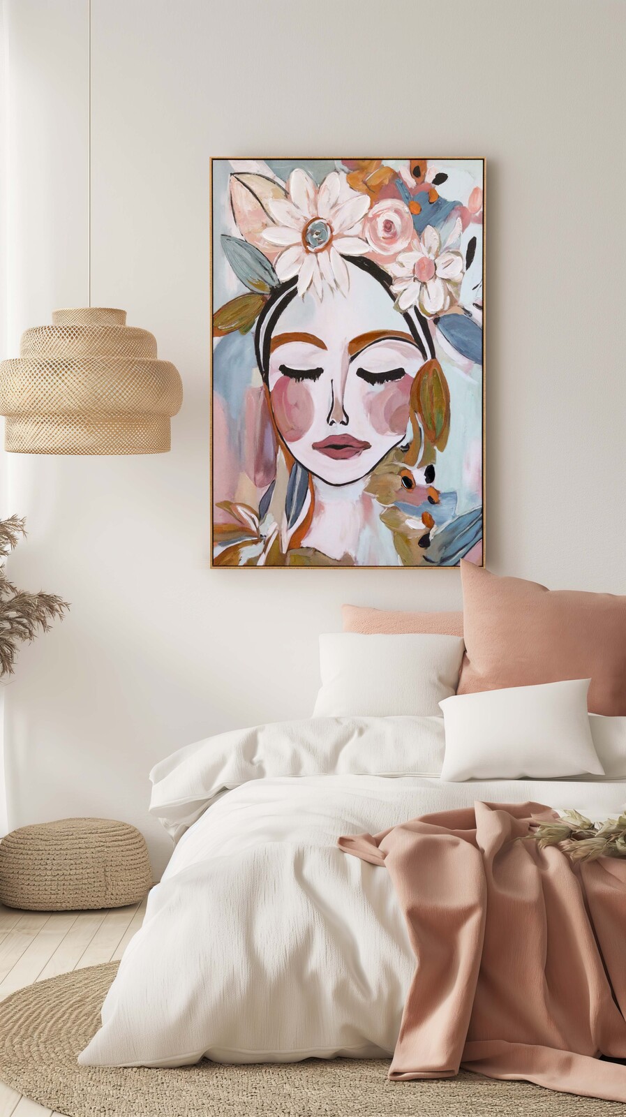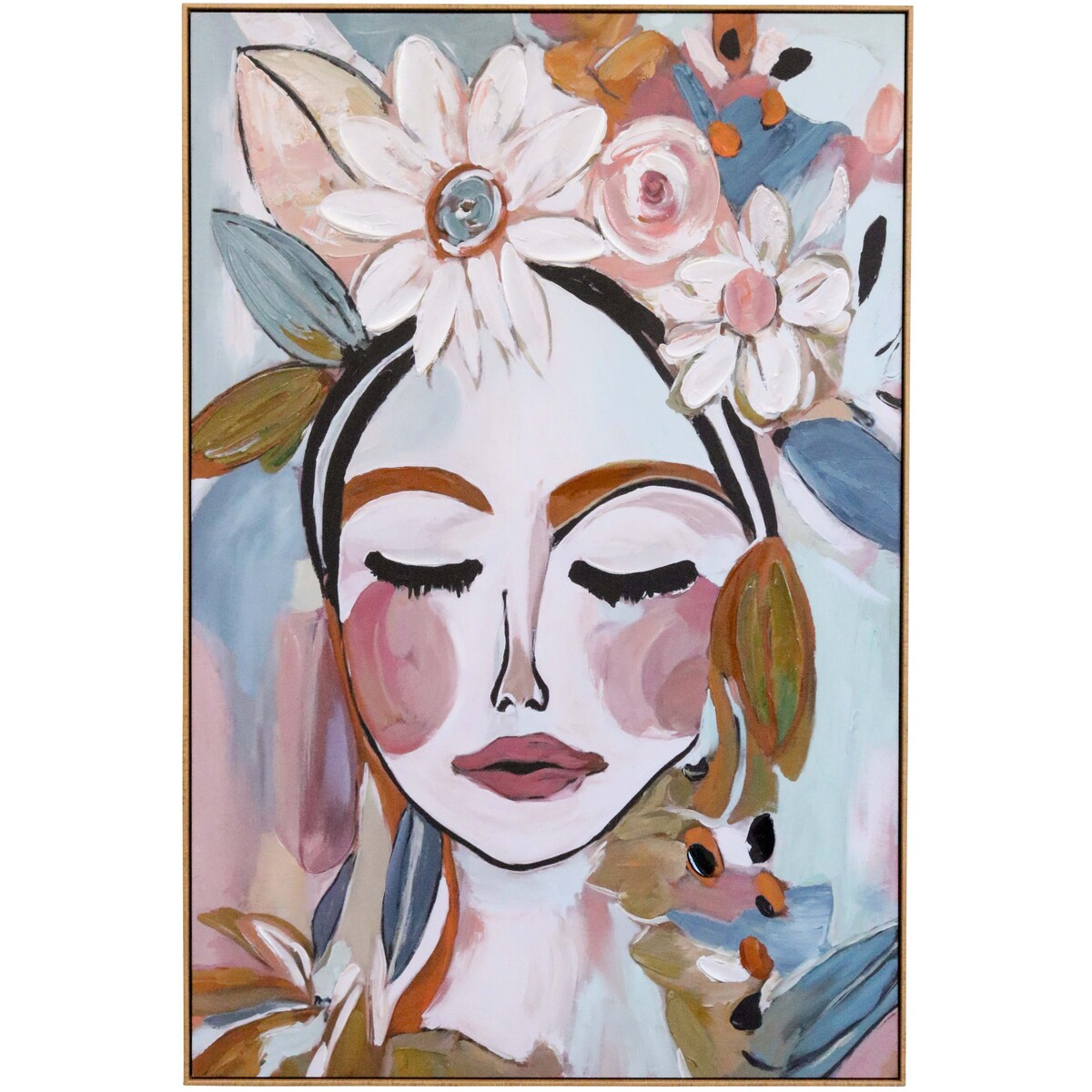We have a real soft spot for this piece. The Framed Canvas Alessoria. It’s got just the right balance between abstract and something really... delicate - expressive but not messy, and soft without being overtly feminine. The slightly oversized 80x120cm is just that little bit extra, but still fits on most walls or above furniture. It’s hand-finished, which always makes a real difference with this style. The gel paint means you can actually see and feel the texture of brushstrokes in the flowers and face - each one’s individual in its own way. There’s an earthy warmth to it thanks to the pine frame and natural palette, but the pastels make it feel fresh too. We’ve seen people get creative with it in lounge rooms, bedrooms, home offices, and even retail spaces. It fits well with contemporary coastal looks or those classic muted palettes that are everywhere at the moment. That floral crown really catches everyone’s attention and ties in with botanical accents other homewares trends are loving lately - but it isn’t too “cottagey”. We think your customers will love how one-of-a-kind these feel in person.