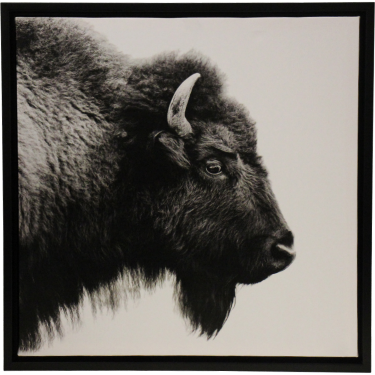 Bring a bit of understated, artful appeal to an empty wall with this eye - catching framed painting print that blends modern aesthetics and rustic, pastoral looks perfectly. The stunning illustration when displayed on a white wall will look as though the bison is glaring into the room from the window created by the inner black frame!