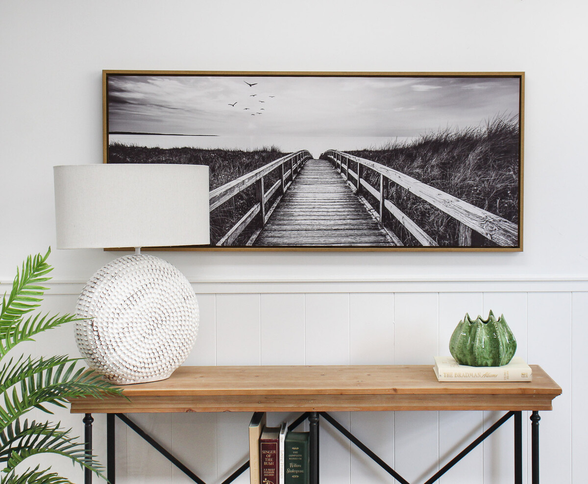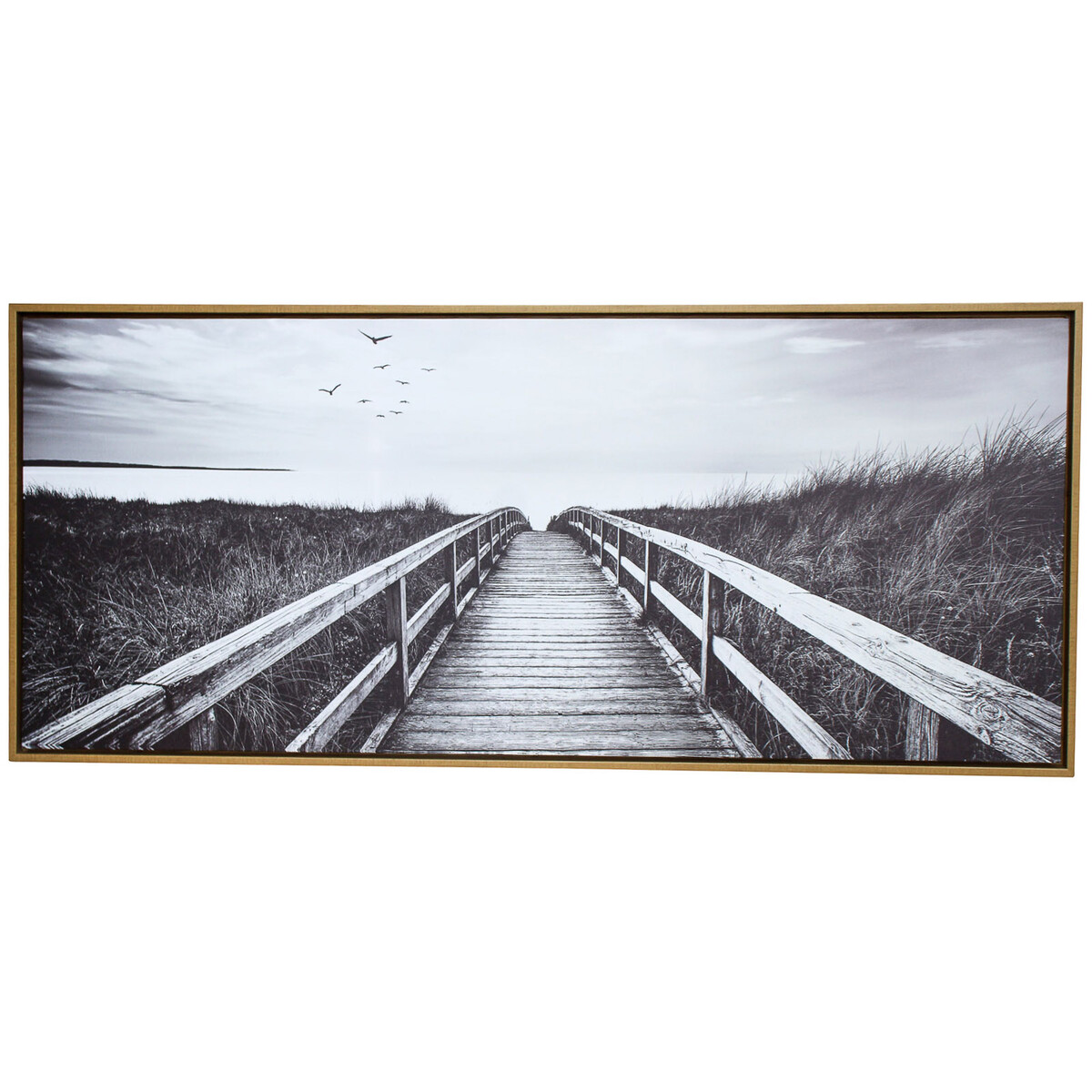 The wooden path way with its curving downwards shape actually is an unexplored path that anyone could like to take-Afterall it promises some amount of excitement of seeking new avenues and finding newer possibilities. Printed on canvas using the latest technology and the best in inks - the depth and vibrancy of the image conveys the usage of the most modern of printing methods that rendered this art work fit for a formal kind of setting. The richness of the inks gives immense depth and a natural feel to the picture. Has been framed for great finish. Give your love for things abstract and unique-create its own statement. The width of the framed art work will span across a large wall and will look especially stunning above a large sideboard or console.