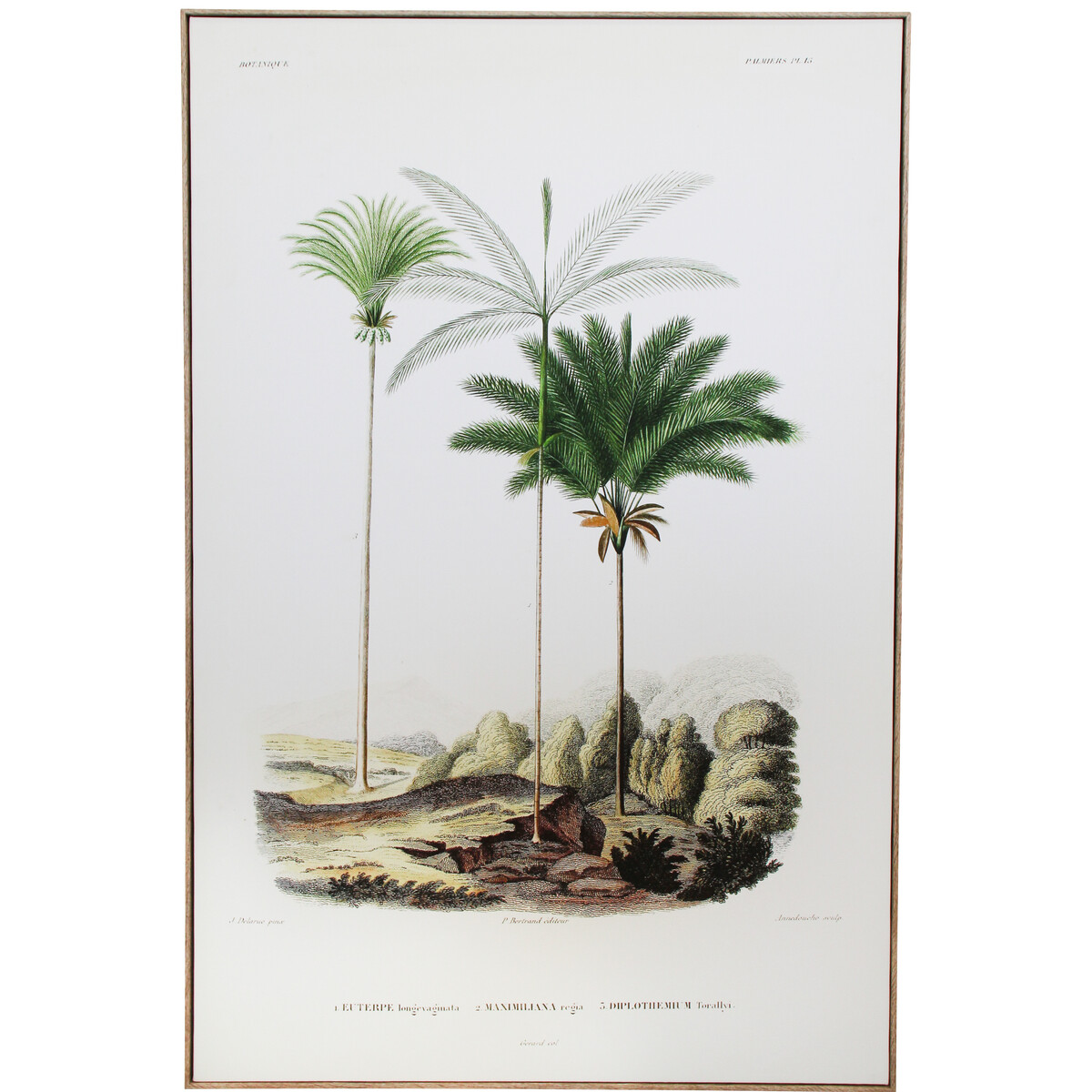 The Framed Canvas Botanic 2 is an alluring painting that possesses a delightful natural decorative accent. It is able to do this through its depiction of nature inspired scenic abstract environment. Rendered on ash coloured premium quality canvas material is the image of boulders and rocks. That which is visually foregrounded however, is the depiction of tall tree plants resembling palm trees but not exactly palm trees. The trees stand tall and graceful while their green coloured leaves lend a bright appeal to the otherwise dull palette.