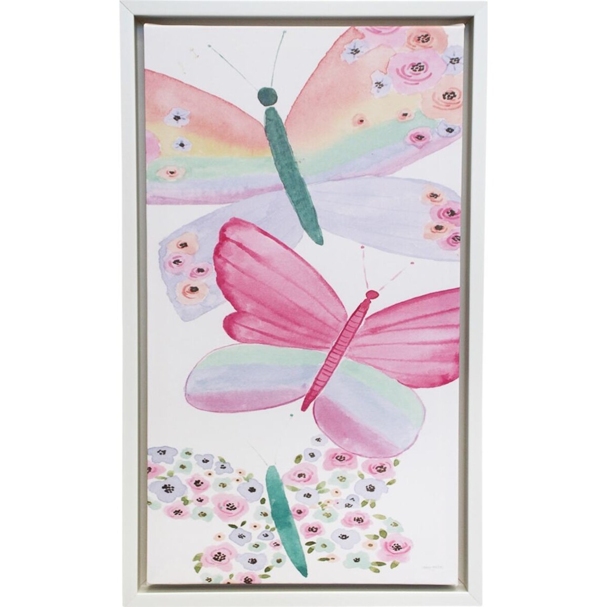 There are several of them, the pattern on their wings an artistically imagined kind-the soft hues of ink gorgeously makes it presence felt in the creamy whiteness of the backdrop. Th watercolour art has bene printed using fine technique that brig alive the delicate hues that the artist had imagined the canvas material helps hold in to the inks give them a deep and impactful look. This panel shaped canvas has also been given this wood frame in pine that adds to its finished looks. Hang it from walls that need a spot of cheer. The soft colours in this one will set the tone of or light pastels and summery hues would in fact be as great for your bedroom as for your children's. Why wait for Spring t set these beauties free in your spaces.